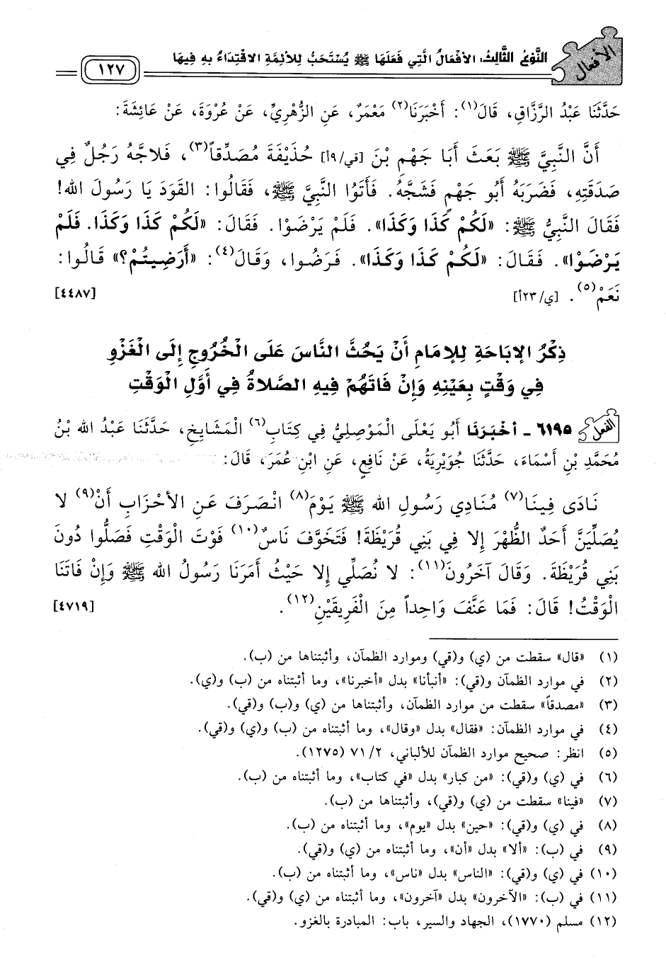 ٦١٩٥ - أَخبَرنا أَبُو يَعْلَى الْمَوْصِلِيُّ فِي كِتَابِ الْمَشَايخِ، حَدثنا عَبْدُ اللهِ بْنُ مُحَمَّدِ بْنِ أَسْمَاءَ، حَدثنا جُوَيْرِيَةُ، عَنْ نَافِعٍ، عَنِ ابْنِ عُمَرَ، قَالَ: نَادَى فِينَا مُنَادِي رَسُولِ اللهِ صَلى الله عَلَيه وسَلم يَوْمَ انْصَرَفَ عَنِ الأَحْزَابِ أَن لَا يُصَلِّيَنَّ أَحَدٌ الظُّهْرَ إِلَاّ فِي بَنِي قُرَيْظَةَ، فَتَخَوَّفَ نَاسٌ فَوْتَ الْوَقْتِ فَصَلُّوا دُونَ بَنِي قُرَيْظَةَ، وَقَالَ آخَرُونَ: لَا نُصَلِّي إِلَاّ حَيْثُ أَمَرَنَا رَسُولُ اللهِ صَلى الله عَلَيه وسَلم وَإِنْ فَاتَنَا الْوَقْتُ، قَالَ: فَمَا عَنَّفَ وَاحِدًا مِنَ الْفَرِيقَيْنِ. [٤٧١٩]