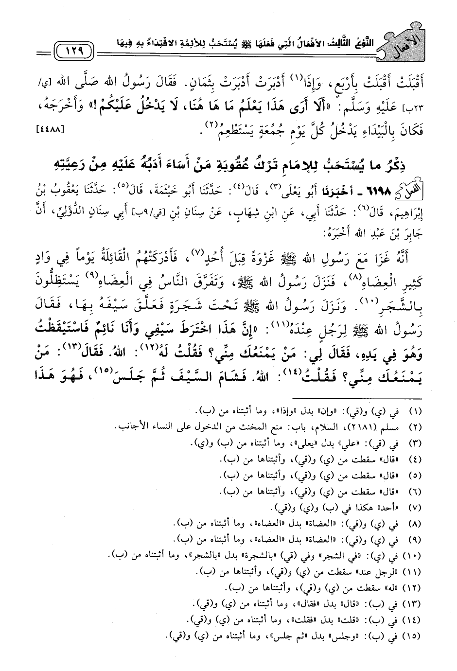 ٦١٩٨ - أَخبَرنا أَبُو يَعْلَى، قَالَ: حَدثنا أَبُو خَيْثَمَةَ، قَالَ: حَدثنا يَعْقُوبُ بْنُ إِبْرَاهِيمَ، قَالَ: حَدثنا أَبِي، عَنِ ابْنِ شِهَابٍ، عَنْ سِنَانِ بْنِ أَبِي سِنَانٍ الدُّؤَلِيِّ، أَنَّ جَابِرَ بْنَ عَبْدِ اللهِ أَخْبَرَهُ، أَنَّهُ غَزَا مَعَ رَسُولِ اللهِ صَلى الله عَلَيه وسَلم غَزْوَةً قِبَلَ أُحُدٍ، فَأَدْرَكَتْهُمُ الْقَائِلَةُ يَوْمًا فِي وَادٍ كَثِيرِ الْعِضَاهِ، فَنَزَلَ رَسُولُ اللهِ صَلى الله عَلَيه وسَلم، وَتَفَرَّقَ النَّاسُ فِي الْعِضَاهِ يَسْتَظِلُّونَ بِالشَّجَرِ، وَنَزَلَ رَسُولُ اللهِ صَلى الله عَلَيه وسَلم تَحْتَ شَجَرَةٍ فَعَلَّقَ سَيْفَهُ بِهَا، فَقَالَ رَسُولُ اللهِ صَلى الله عَلَيه وسَلم لِرَجُلٍ عِنْدَهُ: "إِنَّ هَذَا اخْتَرَطَ سَيْفِي وَأَنَا نَائِمٌ فَاسْتَيْقَظْتُ وَهُوَ فِي يَدِهِ، فَقَالَ لِي: مَنْ يَمْنَعُكَ مِنِّي؟ فَقُلْتُ لَهُ: اللهُ، فَقَالَ: مَنْ يَمْنَعُكَ مِنِّي؟ فَقُلْتُ: اللهُ، فَشَامَ السَّيْفَ ثُمَّ جَلَسَ، فَهُوَ هَذَا جَالِسٌ"، ثُمَّ لَمْ يُعَاقِبْهُ. [٤٥٣٧]