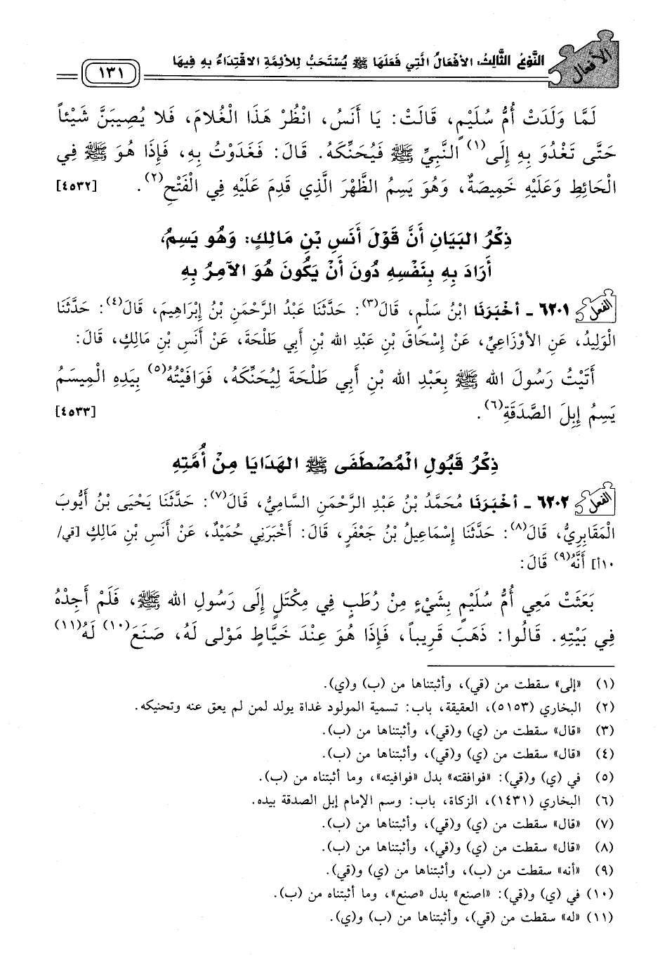 ٦٢٠١ - أَخبَرنا ابْنُ سَلْمٍ، قَالَ: حَدثنا عَبْدُ الرَّحْمَنِ بْنُ إِبْرَاهِيمَ، قَالَ: حَدثنا الْوَلِيدُ، عَنِ الأَوْزَاعِيِّ، عَنْ إِسْحَاقَ بْنِ عَبْدِ اللهِ بْنِ أَبِي طَلْحَةَ، عَنْ أَنَسِ بْنِ مَالِكٍ قَالَ: أَتَيْتُ رَسُولَ اللهِ صَلى الله عَلَيه وسَلم بِعَبْدِ اللهِ بْنِ أَبِي طَلْحَةَ لِيُحَنِّكَهُ، فَوَافَيْتُهُ بِيَدِهِ الْمِيسَمُ يَسِمُ إِبِلَ الصَّدَقَةِ. [٤٥٣٣]