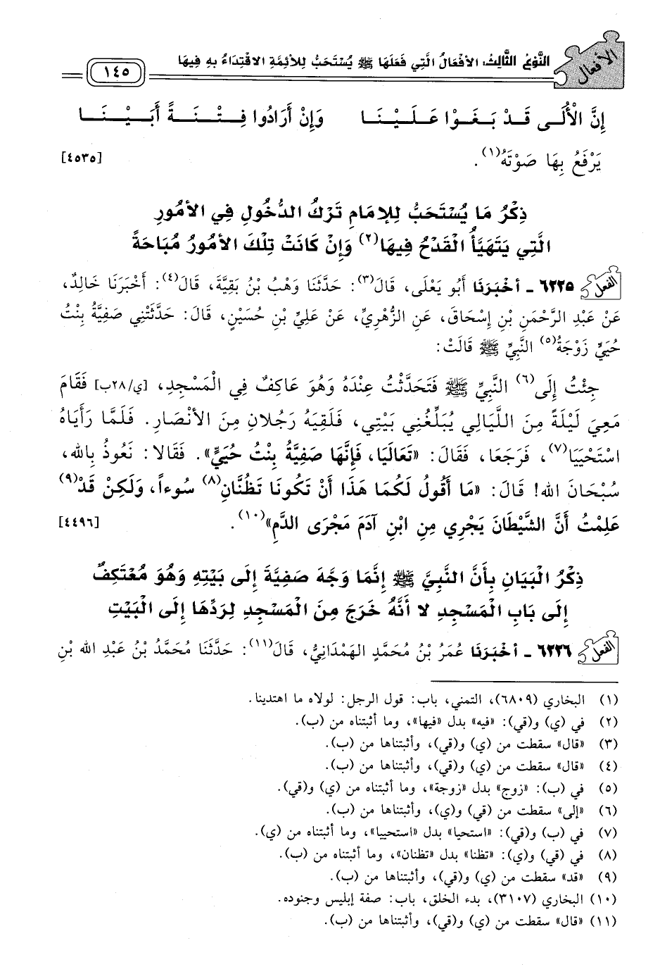 ٦٢٢٦ - أَخبَرنا عُمَرُ بْنُ مُحَمَّدٍ الْهَمْدَانِيُّ، قَالَ: حَدثنا مُحَمَّدُ بْنُ عَبْدِ اللهِ بْنِ عَبْدِ الرَّحِيمِ الْبَرْقِيُّ، قَالَ: حَدثنا سَعِيدُ بْنُ عُفَيْرٍ، قَالَ: حَدثنا اللَّيْثُ، قَالَ: حَدَّثَنِي عَبْدُ الرَّحْمَنِ بْنُ خَالِدِ بْنِ مُسَافِرٍ، عَنِ ابْنِ شِهَابٍ، قَالَ: أَخْبَرَنِي عَلِيُّ بْنُ حُسَيْنٍ، أَنَّ صَفِيَّةَ زَوْجَ النَّبِيِّ صَلى الله عَلَيه وسَلم أَخْبَرَتْهُ، أَنَّهَا جَاءَتْ رَسُولَ اللهِ صَلى الله عَلَيه وسَلم وَهُوَ مُعْتَكِفٌ فِي الْعَشْرِ الأَوَاخِرِ مِنْ رَمَضَانَ، ثُمَّ قَامَتْ تَنْطَلِقُ، فَقَامَ مَعَهَا رَسُولُ اللهِ صَلى الله عَلَيه وسَلم يَقْلِبُهَا، حَتَّى إِذَا بَلَغَ قَرِيبًا مِنْ بَابِ الْمَسْجِدِ عِنْدَ بَابِ أُمِّ سَلَمَةَ زَوْجِ النَّبِيِّ صَلى الله عَلَيه وسَلم مَرَّ بِهِ رَجُلَانِ مِنَ الأَنْصَارِ، فَسَلَّمَا عَلَى رَسُولِ اللهِ صَلى الله عَلَيه وسَلم، ثُمَّ بَعُدَا، فَقَالَ لَهُمَا رَسُولُ اللهِ صَلى الله عَلَيه وسَلم: "عَلَى رِسْلِكُمَا، إِنَّمَا هِيَ صَفِيَّةُ بِنْتُ حُيَيٍّ"، فَقَالَا: سُبْحَانَ اللهِ، يَا رَسُولَ اللهِ! وَكَبُرَ عَلَيْهِمَا ذَلِكَ، فَقَالَ رَسُولُ اللهِ صَلى الله عَلَيه وسَلم: "إِنَّ الشَّيْطَانَ يَبْلُغُ مِنَ الإِنْسَانِ مَبْلَغَ الدَّمِ، وَإِنِّي خِفْتُ أَنْ يَقْذِفَ فِي قُلُوبِكُمَا شَيْئًا". [٤٤٩٧]