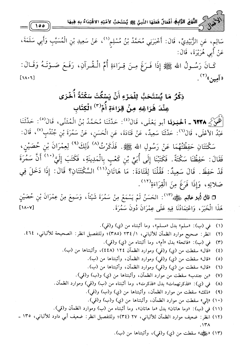 قَالَ أَبُو حَاتِمٍ رَضِيَ اللهُ عَنْهُ: الْحَسَنُ لَمْ يَسْمَعْ مِنْ سَمُرَةَ شَيْئًا، وَسَمِعَ مِنْ عِمْرَانَ بْنِ حُصَيْنٍ هَذَا الْخَبَرَ، وَاعْتِمَادُنَا فِيهِ عَلَى عِمْرَانَ دُونَ سَمُرَةَ. [١٨٠٧]