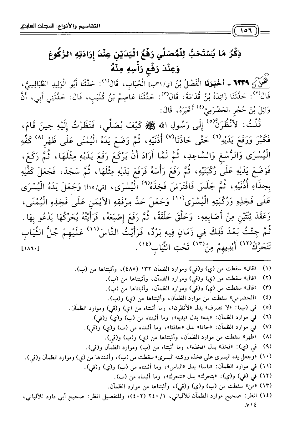 ٦٢٣٩ - أَخبَرنا الْفَضْلُ بْنُ الْحُبَابِ، قَالَ: حَدثنا أَبُو الْوَلِيدِ الطَّيَالِسِيُّ، قَالَ: حَدثنا زَائِدَةُ بْنُ قُدَامَةَ، قَالَ: حَدثنا عَاصِمُ بْنُ كُلَيْبٍ، قَالَ: حَدَّثَنِي أَبِي، أَنَّ وَائِلَ بْنَ حُجْرٍ الْحَضْرَمِيَّ أَخْبَرَهُ، قَالَ: قُلْتُ: لأَنْظُرَنَّ إِلَى رَسُولِ اللهِ صَلى الله عَلَيه وسَلم كَيْفَ يُصَلِّي، فَنَظَرْتُ إِلَيْهِ حِينَ قَامَ، فَكَبَّرَ وَرَفَعَ يَدَيْهِ حَتَّى حَاذَتَا أُذُنَيْهِ، ثُمَّ وَضَعَ يَدَهُ الْيُمْنَى عَلَى ظَهْرِ كَفِّهِ الْيُسْرَى وَالرُّسْغِ وَالسَّاعِدِ، ثُمَّ لَمَّا أَرَادَ أَنْ يَرْكَعَ رَفَعَ يَدَيْهِ مِثْلَهَا، ثُمَّ رَكَعَ، فَوَضَعَ يَدَيْهِ عَلَى رُكْبَتَيْهِ، ثُمَّ رَفَعَ رَأْسَهُ فَرَفَعَ يَدَيْهِ مِثْلَهَا، ثُمَّ سَجَدَ، فَجَعَلَ كَفَّيْهِ بِحِذَاءِ أُذُنَيْهِ، ثُمَّ جَلَسَ فَافْتَرَشَ فَخِذَهُ الْيُسْرَى، وَجَعَلَ يَدَهُ الْيُسْرَى عَلَى فَخِذِهِ وَرُكْبَتِهِ الْيُسْرَى، وَجَعَلَ حَدَّ مِرْفَقِهِ الأَيْمَنِ عَلَى فَخِذِهِ الْيُمْنَى، وَعَقَدَ ثِنْتَيْنِ مِنْ أَصَابِعِهِ، وَحَلَّقَ حَلْقَةً، ثُمَّ رَفَعَ إِصْبَعَهُ، فَرَأَيْتُهُ يُحَرِّكُهَا يَدْعُو بِهَا، ثُمَّ جِئْتُ بَعْدَ ذَلِكَ فِي زَمَانٍ فِيهِ بَرْدٌ، فَرَأَيْتُ النَّاسَ عَلَيْهِمْ جُلُّ الثِّيَابِ تَتَحَرَّكُ أَيْدِيهِمْ مِنْ تَحْتِ الثِّيَابِ. [١٨٦٠]