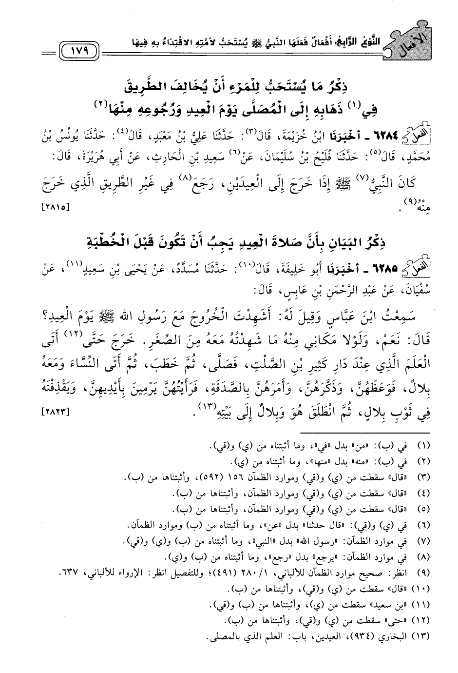 ٦٢٨٤ - أَخبَرنا ابْنُ خُزَيْمَةَ، قَالَ: حَدثنا عَلِيُّ بْنُ مَعْبَدٍ، قَالَ: حَدثنا يُونُسُ بْنُ مُحَمَّدٍ، قَالَ: حَدثنا فُلَيْحُ بْنُ سُلَيْمَانَ، عَنْ سَعِيدِ بْنِ الْحَارِثِ، عَنْ أَبِي هُرَيْرَةَ، قَالَ: كَانَ النَّبِيُّ صَلى الله عَلَيه وسَلم إِذَا خَرَجَ إِلَى الْعِيدَيْنِ، رَجَعَ فِي غَيْرِ الطَّرِيقِ الَّذِي خَرَجَ مِنْهُ. [٢٨١٥]