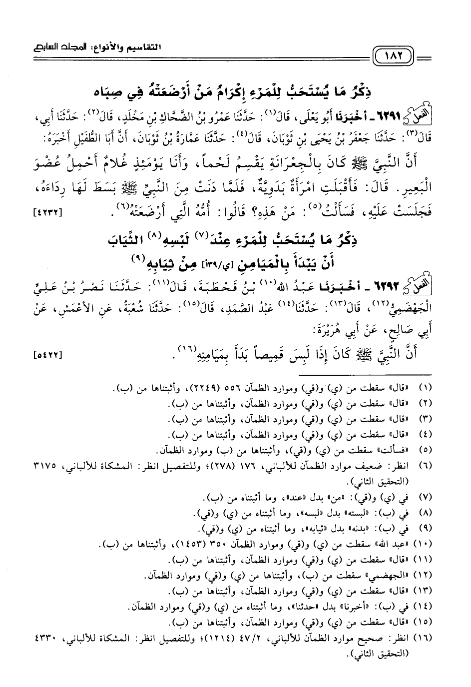 ٦٢٩٢ - أَخبَرنا عَبْدُ اللهِ بْنُ قَحْطَبَةَ، قَالَ: حَدثنا نَصْرُ بْنُ عَلِيٍّ الْجَهْضَمِيُّ، قَالَ: حدثنا عَبْدُ الصَّمَدِ، قَالَ: حَدثنا شُعْبَةُ، عَنِ الأَعْمَشِ، عَنْ أَبِي صَالِحٍ، عَنْ أَبِي هُرَيْرَةَ، أَنَّ النَّبِيَّ صَلى الله عَلَيه وسَلم كَانَ إِذَا لَبِسَ قَمِيصًا بَدَأَ بِمَيَامِنِهِ. [٥٤٢٢]