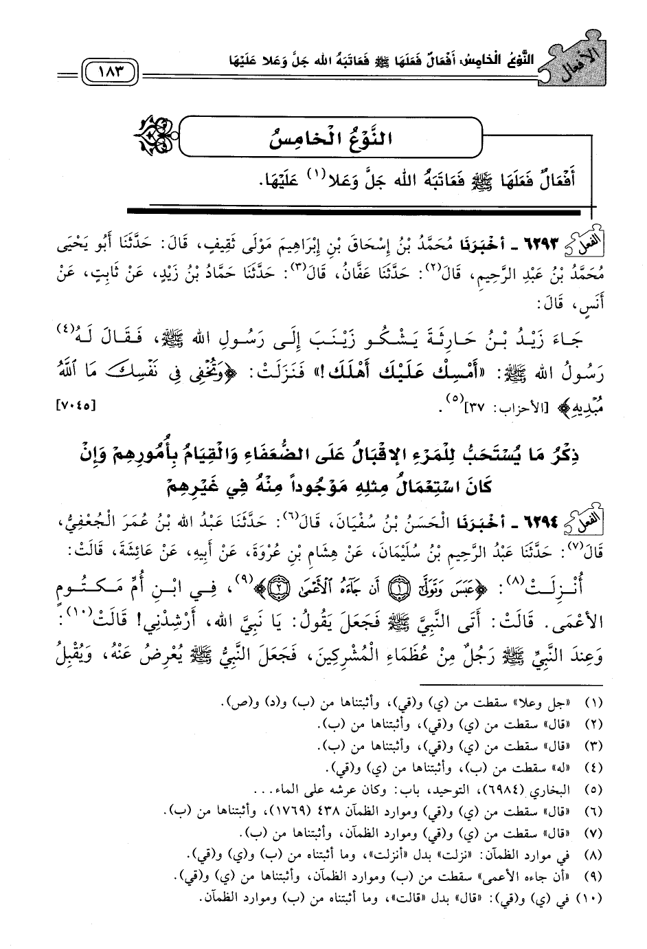 ٦٢٩٣ - أَخبَرنا مُحَمَّدُ بْنُ إِسْحَاقَ بْنِ إِبْرَاهِيمَ مَوْلَى ثَقِيفٍ، قَالَ: حَدثنا أَبُو يَحْيَى مُحَمَّدُ بْنُ عَبْدِ الرَّحِيمِ، قَالَ: حَدثنا عَفَّانُ، قَالَ: حَدثنا حَمَّادُ بْنُ زَيْدٍ، عَنْ ثَابِتٍ، عَنْ أَنَسٍ، قَالَ: جَاءَ زَيْدُ بْنُ حَارِثَةَ يَشْكُو زَيْنَبَ إِلَى رَسُولِ اللهِ صَلى الله عَلَيه وسَلم، فَقَالَ له رَسُولُ اللهِ صَلى الله عَلَيه وسَلم: "أَمْسِكْ عَلَيْكَ أَهْلَكَ" فَنَزَلَتْ: {وَتُخْفِي فِي نَفْسِكَ مَا اللهُ مُبْدِيهِ} [الأحزاب: ٣٧]. [٧٠٤٥]