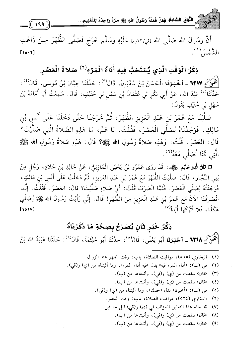 قَالَ أَبُو حَاتِمٍ رَضِيَ اللهُ عَنْهُ: قَدْ رَوَى عَمْرُو بْنُ يَحْيَى الْمَازِنِيُّ، عَنْ خَالِدِ بْنِ خَلَاّدٍ، رَجُلٍ مِنْ بَنِي النَّجَّارِ، قَالَ: صَلَّيْتُ الظُّهْرَ مَعَ عُمَرَ بْنِ عَبْدِ الْعَزِيزِ، ثُمَّ دَخَلْتُ عَلَى أَنَسِ بْنِ مَالِكٍ، فَوَجَدْتُهُ يُصَلِّي الْعَصْرَ، فَلَمَّا انْصَرَفَ، قُلْتُ: أَيَّ صَلَاةٍ صَلَّيْتَ؟ قَالَ: الْعَصْرَ، فَقُلْتُ: إِنَّمَا انْصَرَفْنَا الآنَ مَعَ عُمَرَ بْنِ عَبْدِ الْعَزِيزِ مِنَ الظُّهْرِ! قَالَ: إِنِّي رَأَيْتُ رَسُولَ اللهِ صَلى الله عَلَيه وسَلم يُصَلِّي هَكَذَا، فَلَا أَتْرُكُهَا أَبَدًا. [١٥١٧]