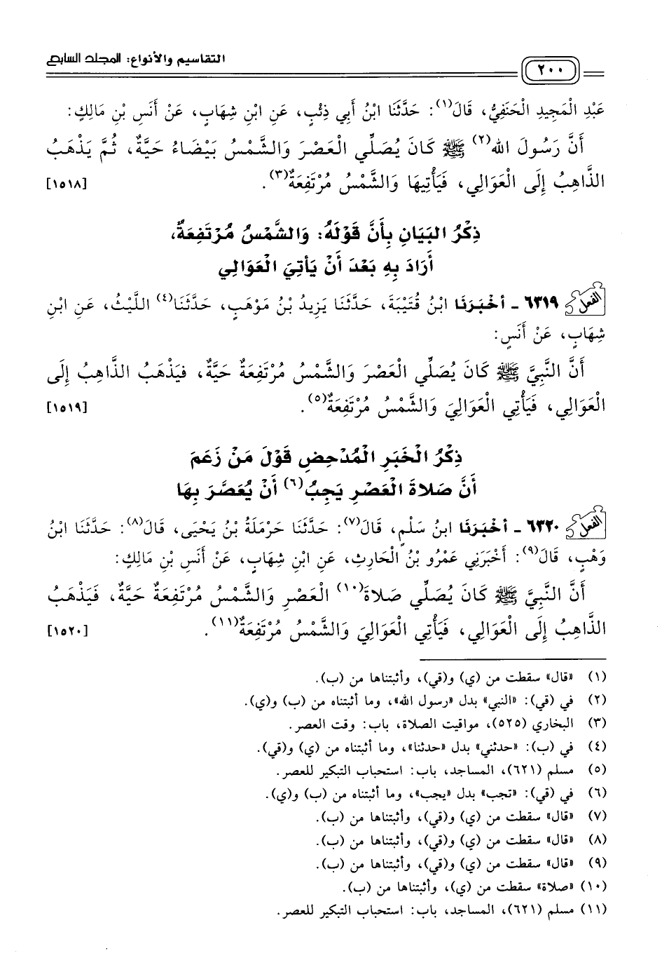 ٦٣٢٠ - أَخبَرنا ابْنُ سَلْمٍ، قَالَ: حَدثنا حَرْمَلَةُ بْنُ يَحْيَى، قَالَ: حَدثنا ابْنُ وَهْبٍ، قَالَ: أَخْبَرَنِي عَمْرِو بْنُ الْحَارِثِ، عَنِ ابْنِ شِهَابٍ، عَنْ أَنَسِ بْنِ مَالِكٍ؛ أَنَّ النَّبِيَّ صَلى الله عَلَيه وسَلم كَانَ يُصَلِّي صَلَاةَ الْعَصْرِ وَالشَّمْسُ مُرْتَفِعَةٌ حَيَّةٌ، فَيَذْهَبُ الذَّاهِبُ إِلَى الْعَوَالِي، فَيَأْتِي الْعَوَالِي وَالشَّمْسُ مُرْتَفِعَةٌ. [١٥٢٠]