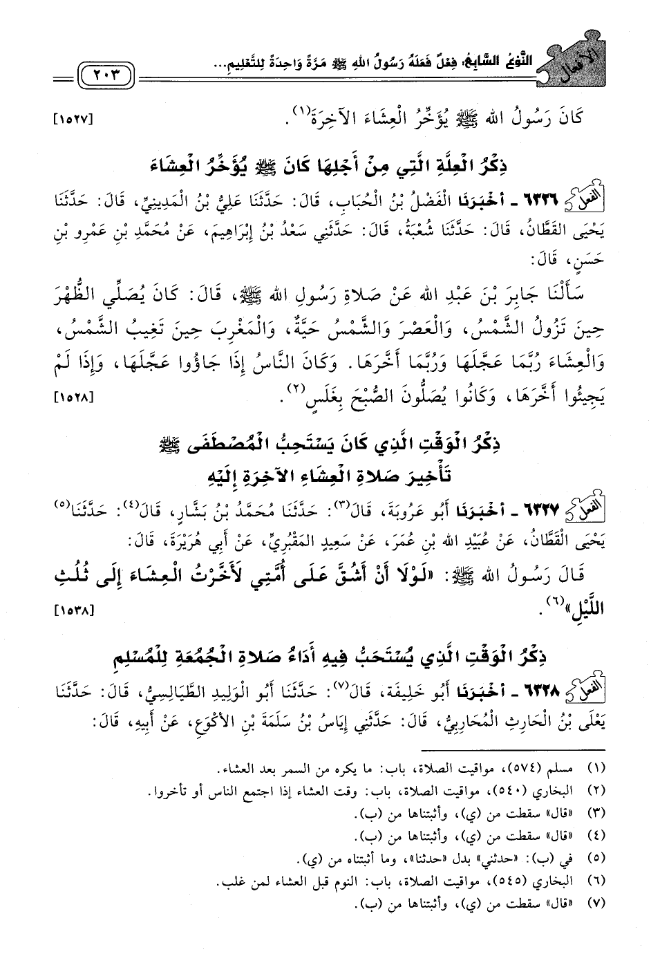 ٦٣٢٧ - أَخبَرنا أَبُو عَرُوبَةَ، قَالَ: حَدثنا مُحَمَّدُ بْنُ بَشَّارٍ، قَالَ: حَدَّثَنَا يَحْيَى الْقَطَّانُ، عَنْ عُبَيْدِ اللهِ بْنِ عُمَرَ، عَنْ سَعِيدٍ الْمَقْبُرِيِّ، عَنْ أَبِي هُرَيْرَةَ، قَالَ: قَالَ رَسُولُ اللهِ صَلى الله عَلَيه وسَلم: "لَوْلَا أَنْ أَشُقَّ عَلَى أُمَّتِي لأَخَّرْتُ الْعِشَاءَ إِلَى ثُلُثِ اللَّيْلِ". [١٥٣٨]