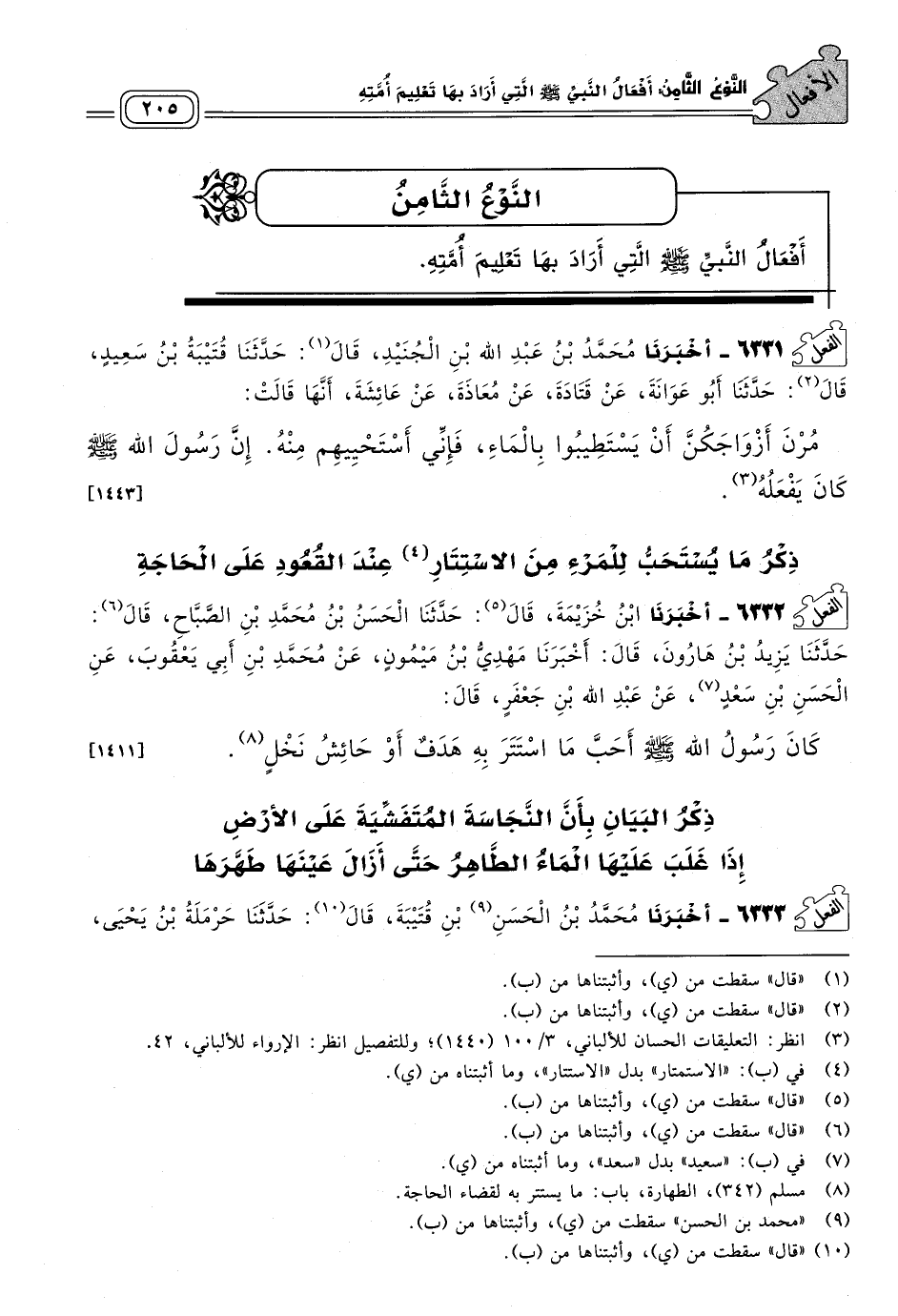 ٦٣٣١ - أَخبَرنا مُحَمَّدُ بْنُ عَبْدِ اللهِ بْنِ الْجُنَيْدِ، قَالَ: حَدثنا قُتَيْبَةُ بْنُ سَعِيدٍ، قَالَ: حَدثنا أَبُو عَوَانَةَ، عَنْ قَتَادَةَ، عَنْ مُعَاذَةَ، عَنْ عَائِشَةَ، أَنَّهَا قَالَتْ: مُرْنَ أَزْوَاجَكُنَّ أَنْ يَسْتَطِيبُوا بِالْمَاءِ، فَإِنِّي أَسْتَحْيِيهِمْ مِنْهُ، إِنَّ رَسُولَ اللهِ صَلى الله عَلَيه وسَلم كَانَ يَفْعَلُهُ. [١٤٤٣]