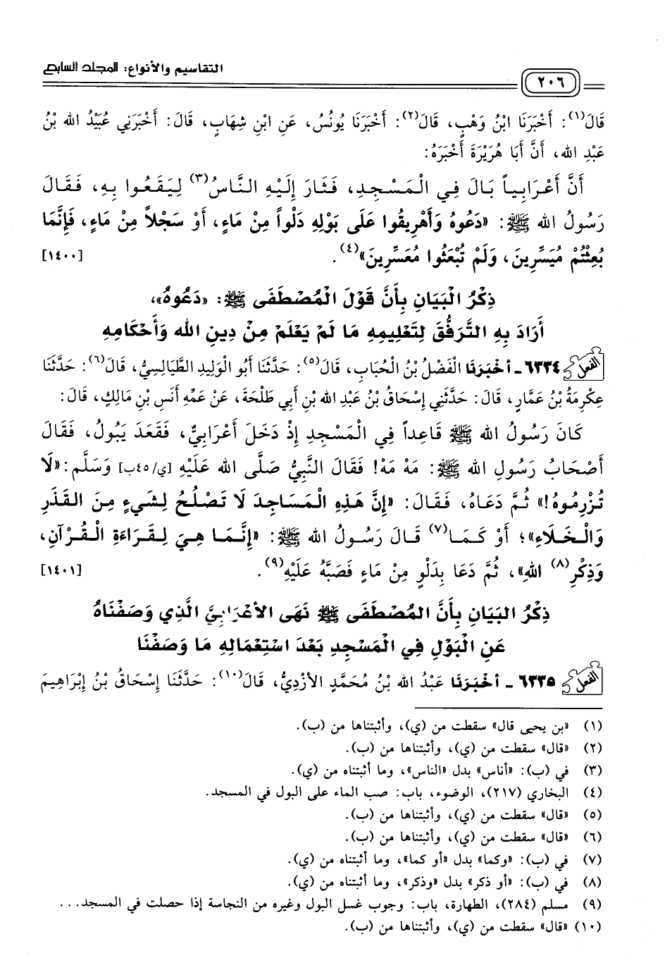 ٦٣٣٤ - أَخبَرنا الْفَضْلُ بْنُ الْحُبَابِ، قَالَ: حَدثنا أَبُو الْوَلِيدِ الطَّيَالِسِيُّ، قَالَ: حَدثنا عِكْرِمَةُ بْنُ عَمَّارٍ، قَالَ: حَدَّثَنِي إِسْحَاقُ بْنُ عَبْدِ اللهِ بْنِ أَبِي طَلْحَةَ، عَنْ عَمِّهِ أَنَسِ بْنِ مَالِكٍ، قَالَ: كَانَ رَسُولُ اللهِ صَلى الله عَلَيه وسَلم قَاعِدًا فِي الْمَسْجِدِ إِذْ دَخَلَ أَعْرَابِيٌّ، فَقَعَدَ يَبُولُ، فَقَالَ أَصْحَابُ رَسُولِ اللهِ صَلى الله عَلَيه وسَلم: مَهْ مَهْ! فَقَالَ النَّبِيُّ صَلى الله عَلَيه وسَلم: "لَا تُزْرِمُوهُ"، ثُمَّ دَعَاهُ، فَقَالَ: "إِنَّ هَذِهِ الْمَسَاجِدَ لَا تَصْلُحُ لِشَيْءٍ مِنَ الْقَذَرِ وَالْخَلَاءِ"، أَوْ كَمَا قَالَ رَسُولُ اللهِ صَلى الله عَلَيه وسَلم: "إِنَّمَا هِيَ لِقِرَاءَةِ الْقُرْآنِ، وَذِكْرِ اللهِ"، ثُمَّ دَعَا بِدَلْوٍ مِنْ مَاءٍ فَصَبَّهُ عَلَيْهِ. [١٤٠١]