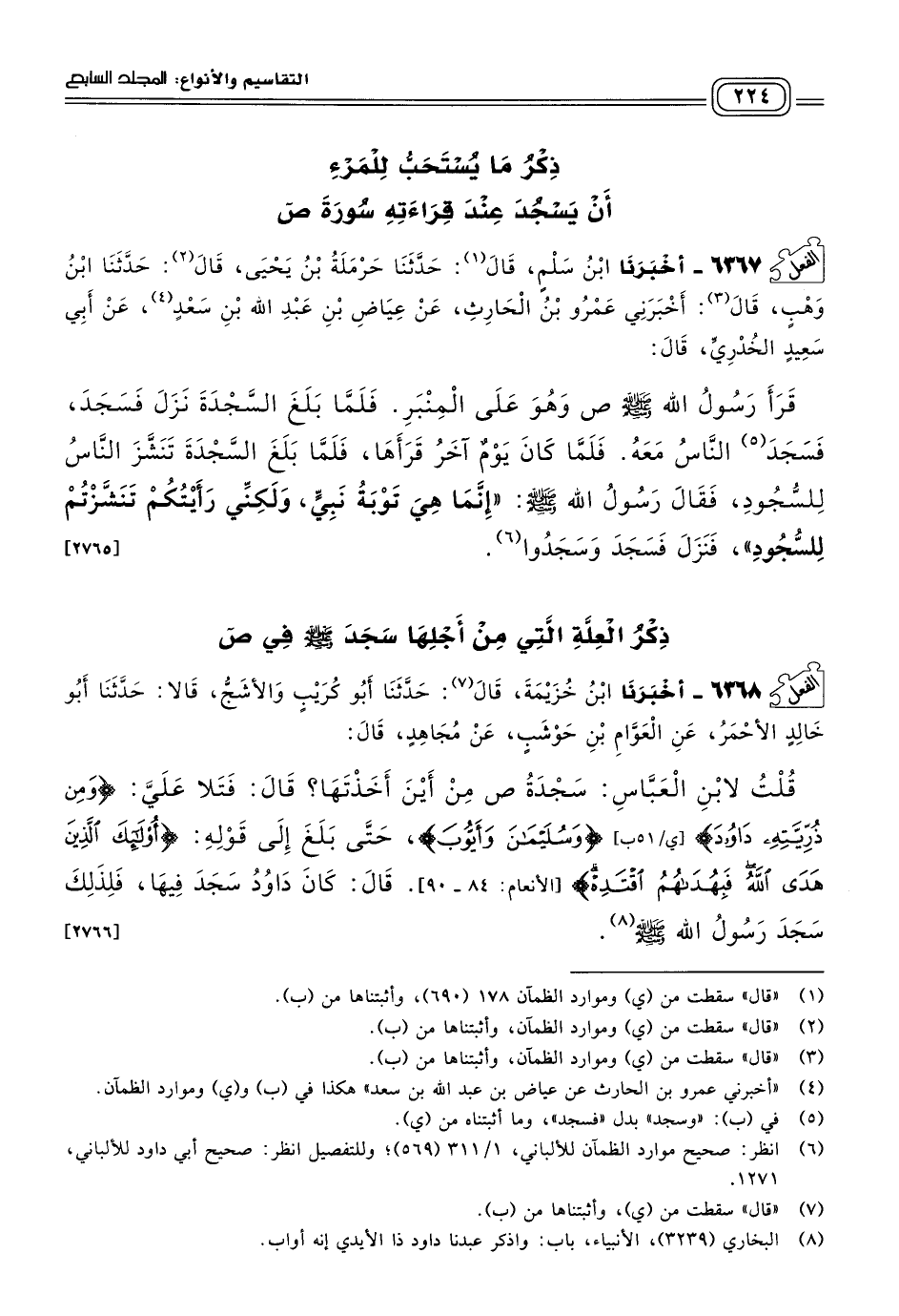٦٣٦٨ - أَخبَرنا ابْنُ خُزَيْمَةَ، قَالَ: حَدثنا أَبُو كُرَيْبٍ وَالأَشَجُّ، قَالَا: حَدثنا أَبُو خَالِدٍ الأَحْمَرُ، عَنِ الْعَوَّامِ بْنِ حَوْشَبٍ، عَنْ مُجَاهِدٍ، قَالَ: قُلْتُ لاِبْنِ الْعَبَّاسِ: سَجْدَةُ "ص" مِنْ أَيْنَ أَخَذْتَهَا؟ قَالَ: فَتَلَا عَلَيَّ: {وَمِنْ ذُرِّيَّتِهِ دَاوُودَ وَسُلَيْمَانَ وَأَيُّوبَ}، حَتَّى بَلَغَ إِلَى قَوْلِهِ: {أُولَئِكَ الَّذِينَ هَدَى اللهُ فَبِهُدَاهُمُ اقْتَدِهْ} [الأنعام: ٨٤ - ٩٠]. قَالَ: كَانَ دَاوُدُ سَجَدَ فِيهَا، فَلِذَلِكَ سَجَدَ رَسُولُ اللهِ صَلى الله عَلَيه وسَلم. [٢٧٦٦]