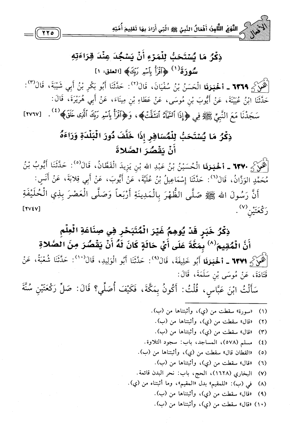٦٣٧٠ - أَخبَرنا الْحُسَيْنُ بْنُ عَبْدِ اللهِ بْنِ يَزِيدَ الْقَطَّانُ، قَالَ: حَدثنا أَيُّوبُ بْنُ مُحَمَّدٍ الْوَزَّانُ، قَالَ: حَدثنا إِسْمَاعِيلُ ابْنُ عُلَيَّةَ، عَنْ أَيُّوبَ، عَنْ أَبِي قِلَابَةَ، عَنْ أَنَسٍ، أَنَّ رَسُولَ اللهِ صَلى الله عَلَيه وسَلم صَلَّى الظُّهْرَ بِالْمَدِينَةِ أَرْبَعًا وَصَلَّى الْعَصْرَ بِذِي الْحُلَيْفَةِ رَكْعَتَيْنِ. [٢٧٤٧]