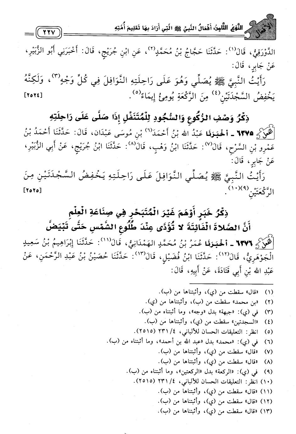 ٦٣٧٥ - أَخبَرنا عَبْدُ اللهِ بْنُ أَحْمَدَ بْنِ مُوسَى عَبْدَانُ، قَالَ: حَدثنا أَحْمَدُ بْنُ عَمْرِو بْنِ السَّرْحِ، قَالَ: حَدثنا ابْنُ وَهْبٍ، قَالَ: حَدثنا ابْنُ جُرَيْجٍ، عَنْ أَبِي الزُّبَيْرِ، عَنْ جَابِرٍ، قَالَ: رَأَيْتُ النَّبِيَّ صَلى الله عَلَيه وسَلم يُصَلِّي النَّوَافِلَ عَلَى رَاحِلَتِهِ يَخْفِضُ السَّجْدَتَيْنِ مِنَ الرَّكْعَتَيْنِ. [٢٥٢٥]