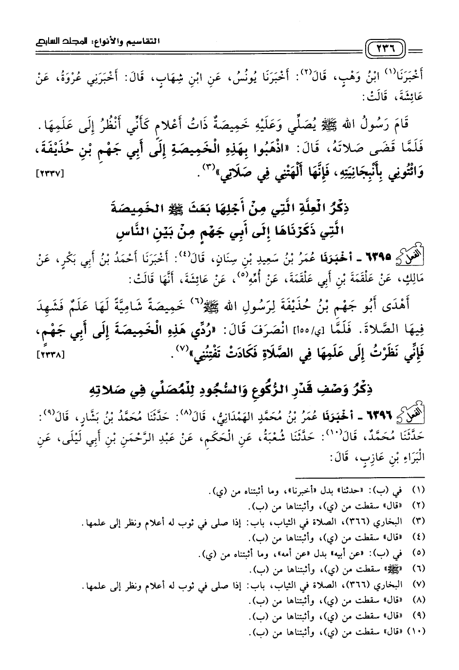 ٦٣٩٥ - أَخبَرنا عُمَرُ بْنُ سَعِيدِ بْنِ سِنَانٍ، قَالَ: أَخبَرنا أَحْمَدُ بْنُ أَبِي بَكْرٍ، عَنْ مَالِكٍ، عَنْ عَلْقَمَةَ بْنِ أَبِي عَلْقَمَةَ، عَنْ أُمِّهِ، عَنْ عَائِشَةَ، أَنَّهَا قَالَتْ: أَهْدَى أَبُو جَهْمِ بْنُ حُذَيْفَةَ لِرَسُولِ اللهِ صَلى الله عَلَيه وسَلم خَمِيصَةً شَامِيَّةً لَهَا عَلَمٌ، فَشَهِدَ فِيهَا الصَّلَاةَ، فَلَمَّا انْصَرَفَ قَالَ: "رُدِّي هَذِهِ الْخَمِيصَةَ إِلَى أَبِي جَهْمٍ، فَإِنِّي نَظَرْتُ إِلَى عَلَمِهَا فِي الصَّلَاةِ فَكَادَتْ تَفْتِنُنِي". [٢٣٣٨]