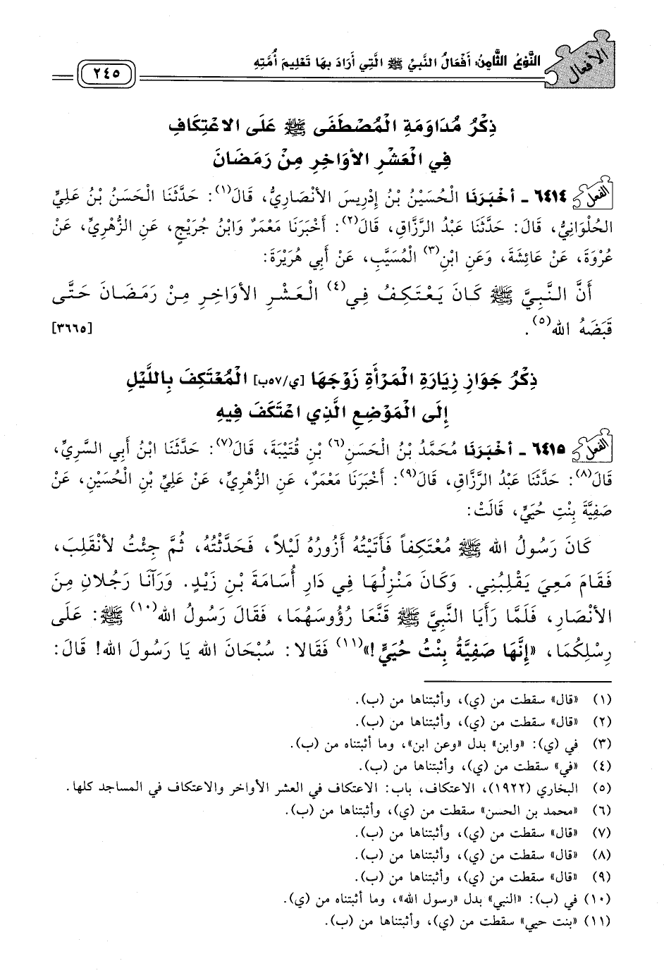 ذِكْرُ جَوَازِ زِيَارَةِ الْمَرْأَةِ زَوْجَهَا الْمُعْتَكِفَ بِاللَّيْلِ إِلَى الْمَوْضِعِ الَّذِي اعْتَكَفَ فِيهِ.