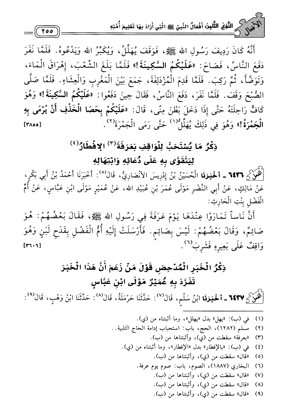 ٦٤٣٦ - أَخبَرنا الْحُسَيْنُ بْنُ إِدْرِيسَ الأَنْصَارِيُّ، قَالَ: أَخبَرنا أَحْمَدُ بْنُ أَبِي بَكْرٍ، عَنْ مَالِكٍ، عَنْ أَبِي النَّضْرِ مَوْلَى عُمَرَ بْنِ عُبَيْدِ اللهِ، عَنْ عُمَيْرٍ مَوْلَى ابْنِ عَبَّاسٍ، عَنْ أُمِّ الْفَضْلِ بِنْتِ الْحَارِثِ؛ أَنَّ نَاسًا تَمَارَوْا عِنْدَهَا يَوْمَ عَرَفَةَ فِي رَسُولِ اللهِ صَلى الله عَلَيه وسَلم، فَقَالَ بَعْضُهُمْ: هُوَ صَائِمٌ، وَقَالَ بَعْضُهُمْ: لَيْسَ بِصَائِمٍ، فَأَرْسَلَتْ إِلَيْهِ أُمُّ الْفَضْلِ بِقَدَحِ لَبَنٍ وَهُوَ وَاقِفٌ عَلَى بَعِيرِهِ فَشَرِبَ. [٣٦٠٦]
