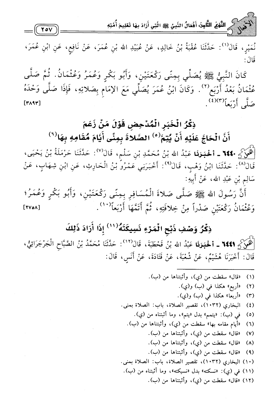 ٦٤٤٠ - أَخبَرنا عَبْدُ اللهِ بْنُ مُحَمَّدِ بْنِ سَلْمٍ، قَالَ: حَدثنا حَرْمَلَةُ بْنُ يَحْيَى، قَالَ: حَدثنا ابْنُ وَهْبٍ، قَالَ: أَخْبَرَنِي عَمْرُو بْنُ الْحَارِثِ، عَنِ ابْنِ شِهَابٍ، عَنْ سَالِمِ بْنِ عَبْدِ اللهِ، عَنْ أَبِيهِ، أَنَّ رَسُولَ اللهِ صَلى الله عَلَيه وسَلم صَلَّى صَلَاةَ الْمُسَافِرِ بِمِنًى رَكْعَتَيْنِ، وَأَبُو بَكْرٍ وَعُمَرُ، وَعُثْمَانُ رَكْعَتَيْنِ صَدْرًا مِنْ خِلَافَتِهِ، ثُمَّ أَتَمَّهَا أَرْبَعًا. [٢٧٥٨]