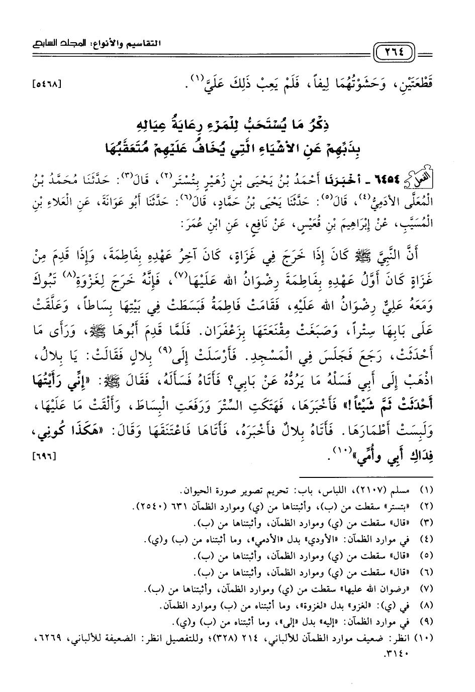 ٦٤٥٤ - أَخبَرنا أَحْمَدُ بْنُ يَحْيَى بْنِ زُهَيْرٍ بتستر، قَالَ: حَدثنا مُحَمَّدُ بْنُ الْمُعَلَّى الأَدَمِيُّ، قَالَ: حَدثنا يَحْيَى بْنُ حَمَّادٍ، قَالَ: حَدثنا أَبُو عَوَانَةَ، عَنِ الْعَلَاءِ بْنِ الْمُسَيَّبِ، عَنْ إِبْرَاهِيمَ بْنِ قُعَيْسٍ، عَنْ نَافِعٍ، عَنِ ابْنِ عُمَرَ؛ أَنَّ النَّبِيَّ صَلى الله عَلَيه وسَلم كَانَ إِذَا خَرَجَ فِي غَزَاةٍ كَانَ آخِرُ عَهْدِهِ بِفَاطِمَةَ، وَإِذَا قَدِمَ مِنْ غَزَاةٍ كَانَ أَوَّلُ عَهْدِهِ بِفَاطِمَةَ رِضْوَانُ اللهِ عَلَيْهَا، فَإِنَّهُ خَرَجَ لِغَزْوَةِ تَبُوكَ وَمَعَهُ عَلِيٌّ رِضْوَانُ اللهِ عَلَيْهِ، فَقَامَتْ فَاطِمَةُ فَبَسَطَتْ فِي بَيْتِهَا بِسَاطًا، وَعَلَّقَتْ عَلَى بَابِهَا سِتْرًا، وَصَبَغَتْ مِقْنَعَتَهَا بِزَعْفَرَانٍ، فَلَمَّا قَدِمَ أَبُوهَا صَلى الله عَلَيه وسَلم وَرَأَى مَا أَحْدَثَتْ، رَجَعَ فَجَلَسَ فِي الْمَسْجِدِ، فَأَرْسَلَتْ إِلَى بِلَالٍ فَقَالَتْ: يَا بِلَالُ، اذْهَبْ إِلَى أَبِي فَسَلْهُ مَا يَرُدُّهُ عَنْ بَابِي؟ فَأَتَاهُ فَسَأَلَهُ، فَقَالَ صَلى الله عَلَيه وسَلم: "إِنِّي رَأَيْتُهَا أَحْدَثَتْ ثَمَّ شَيْئًا"، فَأَخْبَرَهَا، فَهَتَكَتِ السِّتْرَ وَرَفَعَتِ الْبِسَاطَ، وَأَلْقَتْ مَا عَلَيْهَا، وَلَبِسَتْ أَطْمَارَهَا، فَأَتَاهُ بِلَالٌ فَأَخْبَرَهُ، فَأَتَاهَا فَاعْتَنَقَهَا وَقَالَ: "هَكَذَا كُونِي، فِدَاكِ أَبِي وَأُمِّي". [٦٩٦]