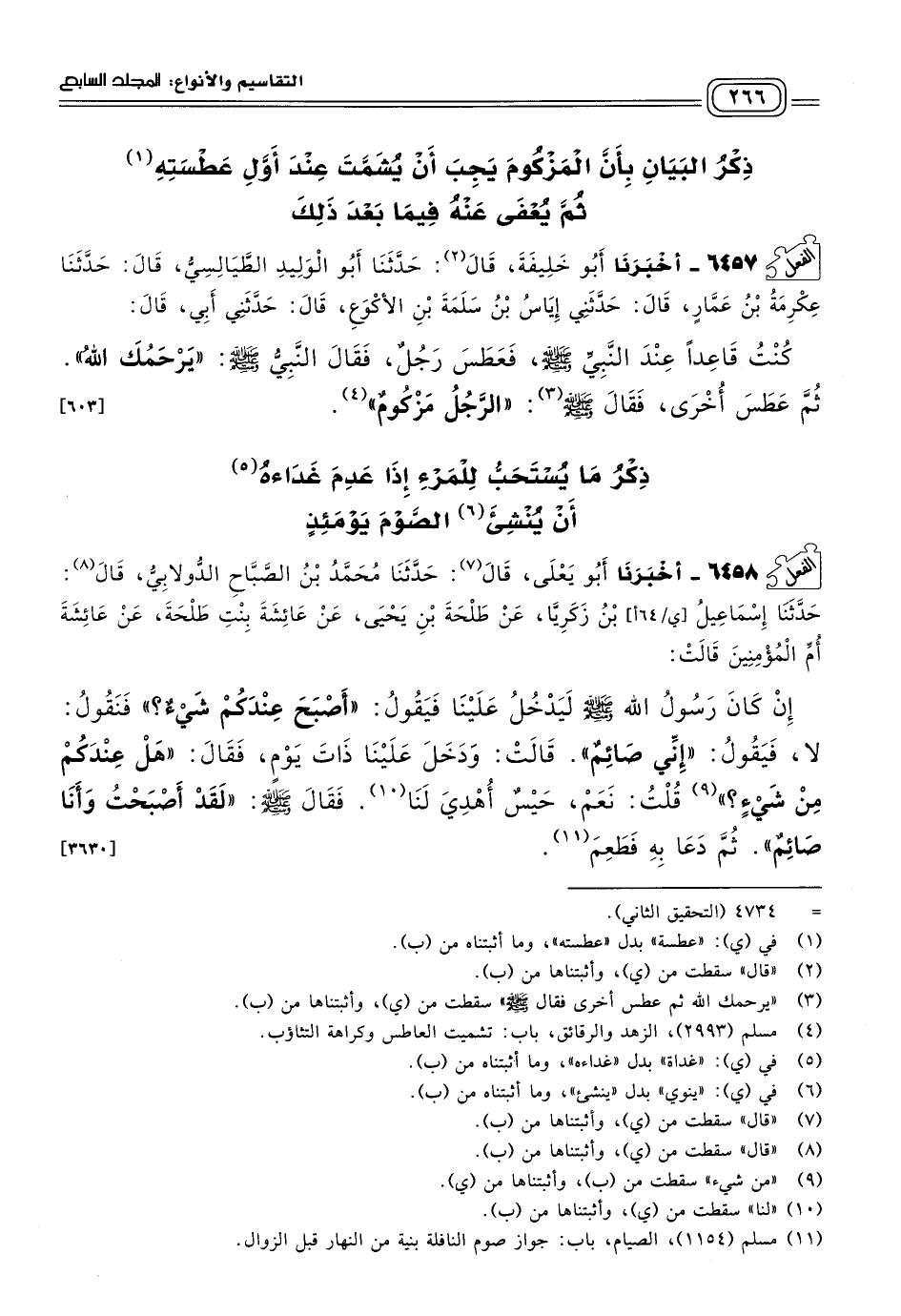 ٦٤٥٨ - أَخبَرنا أَبُو يَعْلَى، قَالَ: حَدثنا مُحَمَّدُ بْنُ الصَّبَّاحِ الدُّولَابِيُّ، قَالَ: حَدثنا إِسْمَاعِيلُ بْنُ زَكَرِيَّا، عَنْ طَلْحَةَ بْنِ يَحْيَى، عَنْ عَائِشَةَ بِنْتِ طَلْحَةَ، عَنْ عَائِشَةَ أُمِّ الْمُؤْمِنِينَ قَالَتْ: إِنْ كَانَ رَسُولُ اللهِ صَلى الله عَلَيه وسَلم لَيَدْخُلُ عَلَيْنَا فَيَقُولُ: "أَصْبَحَ عِنْدَكُمْ شَيْءٌ؟ " فَنَقُولُ: لَا، فَيَقُولُ: "إِنِّي صَائِمٌ"، قَالَتْ: وَدَخَلَ عَلَيْنَا ذَاتَ يَوْمٍ، فَقَالَ: "هَلْ عِنْدَكُمْ مِنْ شَيْءٍ؟ " قُلْتُ: نَعَمْ، حَيْسٌ أُهْدِيَ لَنَا، فَقَالَ صَلى الله عَلَيه وسَلم: "لَقَدْ أَصْبَحْتُ وَأَنَا صَائِمٌ"، ثُمَّ دَعَا بِهِ فَطَعِمَ. [٣٦٣٠]