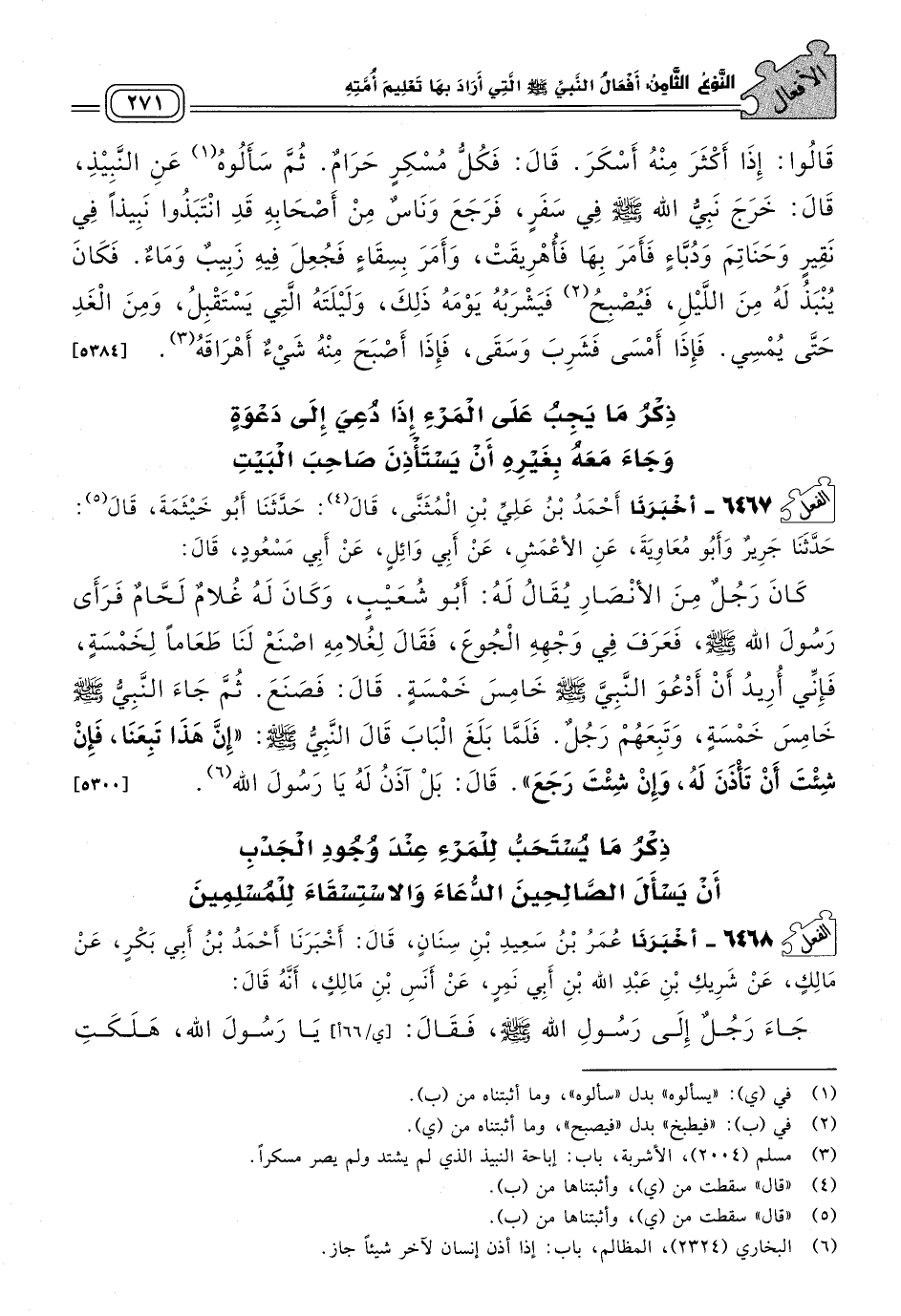 ٦٤٦٧ - أَخبَرنا أَحْمَدُ بْنُ عَلِيِّ بْنِ الْمُثَنَّى، قَالَ: حَدثنا أَبُو خَيْثَمَةَ، قَالَ: حَدثنا جَرِيرٌ، وَأَبُو مُعَاوِيَةَ، عَنِ الأَعْمَشِ، عَنْ أَبِي وَائِلٍ، عَنْ أَبِي مَسْعُودٍ، قَالَ: كَانَ رَجُلٌ مِنَ الأَنْصَارِ يُقَالُ لَهُ: أَبُو شُعَيْبٍ، وَكَانَ لَهُ غُلَامٌ لَحَّامٌ، فَرَأَى رَسُولَ اللهِ صَلى الله عَلَيه وسَلم فَعَرَفَ فِي وَجْهِهِ الْجُوعَ، فَقَالَ لِغُلَامِهِ: اصْنَعْ لَنَا طَعَامًا لِخَمْسَةٍ، فَإِنِّي أُرِيدُ أَنْ أَدْعُوَ النَّبِيَّ صَلى الله عَلَيه وسَلم خَامِسَ خَمْسَةٍ، قَالَ: فَصَنَعَ، ثُمَّ جَاءَ النَّبِيُّ صَلى الله عَلَيه وسَلم خَامِسَ خَمْسَةٍ، وَتَبِعَهُمْ رَجُلٌ، فَلَمَّا بَلَغَ الْبَابَ قَالَ النَّبِيُّ صَلى الله عَلَيه وسَلم: "إِنَّ هَذَا تَبِعَنَا، فَإِنْ شِئْتَ أَنْ تَأْذَنَ لَهُ، وَإِنْ شِئْتَ رَجَعَ"، قَالَ: بَلْ آذَنُ لَهُ يَا رَسُولَ اللهِ. [٥٣٠٠]
