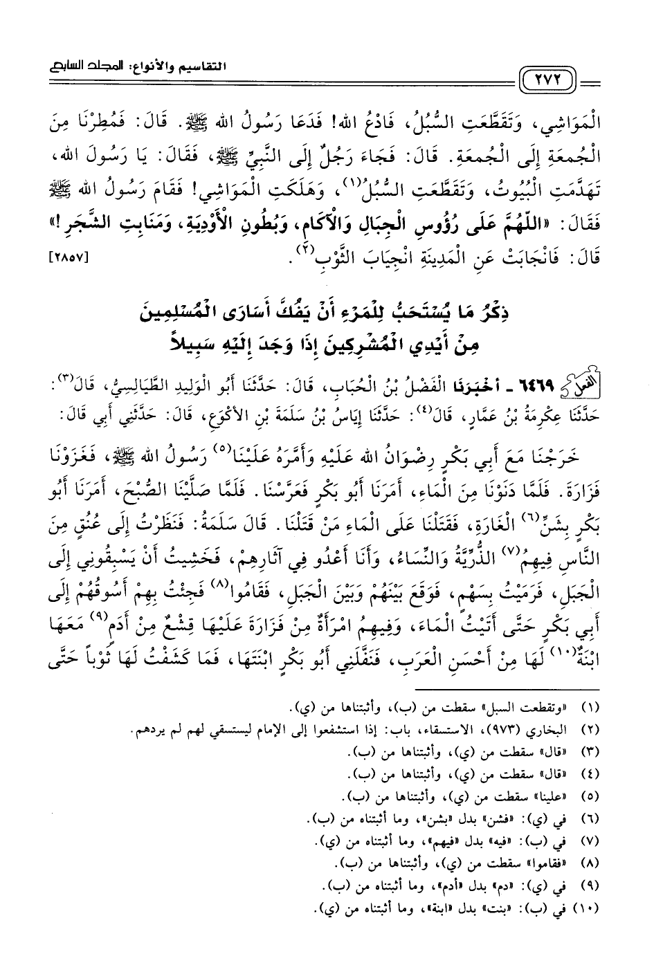 ٦٤٦٩ - أَخبَرنا الْفَضْلُ بْنُ الْحُبَابِ، قَالَ: حَدثنا أَبُو الْوَلِيدِ الطَّيَالِسِيُّ، قَالَ: حَدثنا عِكْرِمَةُ بْنُ عَمَّارٍ، قَالَ: حَدثنا إِيَاسُ بْنُ سَلَمَةَ بْنِ الأَكْوَعِ، قَالَ: حَدَّثَنِي أَبِي، قَالَ: خَرَجْنَا مَعَ أَبِي بَكْرٍ رِضْوَانُ اللهُ عَلَيْهِ وَأَمَّرَهُ عَلَيْنَا رَسُولُ اللهِ صَلى الله عَلَيه وسَلم، فَغَزَوْنَا فَزَارَةَ، فَلَمَّا دَنَوْنَا مِنَ الْمَاءِ، أَمَرَنَا أَبُو بَكْرٍ فَعَرَّسْنَا، فَلَمَّا صَلَّيْنَا الصُّبْحَ، أَمَرَنَا أَبُو بَكْرٍ بِشَنِّ الْغَارَةِ، فَقَتَلْنَا عَلَى الْمَاءِ مَنْ قَتَلْنَا، قَالَ سَلَمَةُ: فَنَظَرْتُ إِلَى عُنُقٍ مِنَ النَّاسِ فِيهِمُ الذُّرِّيَّةُ وَالنِّسَاءُ وَأَنَا أَعْدُو فِي آثَارِهِمْ، فَخَشِيتُ أَنْ يَسْبِقُونِي إِلَى الْجَبَلِ، فَرَمَيْتُ بِسَهْمٍ، فَوَقَعَ بَيْنَهُمْ وَبَيْنَ الْجَبَلِ، فَقَامُوا فَجِئْتُ بِهِمْ أَسُوقُهُمْ إِلَى أَبِي بَكْرٍ حَتَّى أَتَيْتُ الْمَاءَ، وَفِيهِمُ امْرَأَةٌ مِنْ فَزَارَةَ عَلَيْهَا قِشْعٌ مِنْ أَدَمٍ مَعَهَا ابْنَةٌ لَهَا مِنْ أَحْسَنِ الْعَرَبِ، فَنَفَّلَنِي أَبُو بَكْرٍ ابْنَتَهَا، فَمَا كَشَفْتُ لَهَا ثَوْبًا حَتَّى قَدِمْتُ الْمَدِينَةَ، ثُمَّ بِتُّ وَلَمْ أَكْشِفْ لَهَا ثَوْبًا، فَلَقِيَنِي رَسُولُ اللهِ صَلى الله عَلَيه وسَلم، فَقَالَ: "هَبْ لِيَ الْمَرْأَةَ"، فَقُلْتُ: يَا رَسُولَ اللهِ، لَقَدْ أَعْجَبَتْنِي وَمَا كَشَفْتُ لَهَا ثَوْبًا، فَسَكَتَ رَسُولُ اللهِ صَلى الله عَلَيه وسَلم، وَتَرَكَنِي، ثُمَّ لَقِيَنِي مِنَ الْغَدِ فِي السُّوقِ، فَقَالَ: "يَا سَلَمَةُ، هَبْ لِيَ الْمَرْأَةَ، للهِ أَبُوكَ"، قَالَ: قُلْتُ: يَا رَسُولَ اللهِ، والله مَا كَشَفْتُ لَهَا ثَوْبًا، فَهِيَ لَكَ يَا رَسُولَ اللهِ، قَالَ: فَبَعَثَ بِهَا رَسُولُ اللهِ صَلى الله عَلَيه وسَلم إِلَى أَهْلِ مَكَّةَ وَفِي أَيْدِيهِمْ أَسْرَى مِنَ الْمُسْلِمِينَ، فَفَدَاهُمْ بِتِلْكَ الْمَرْأَةِ، فَكَّهُمْ بِهَا. [٤٨٦٠]