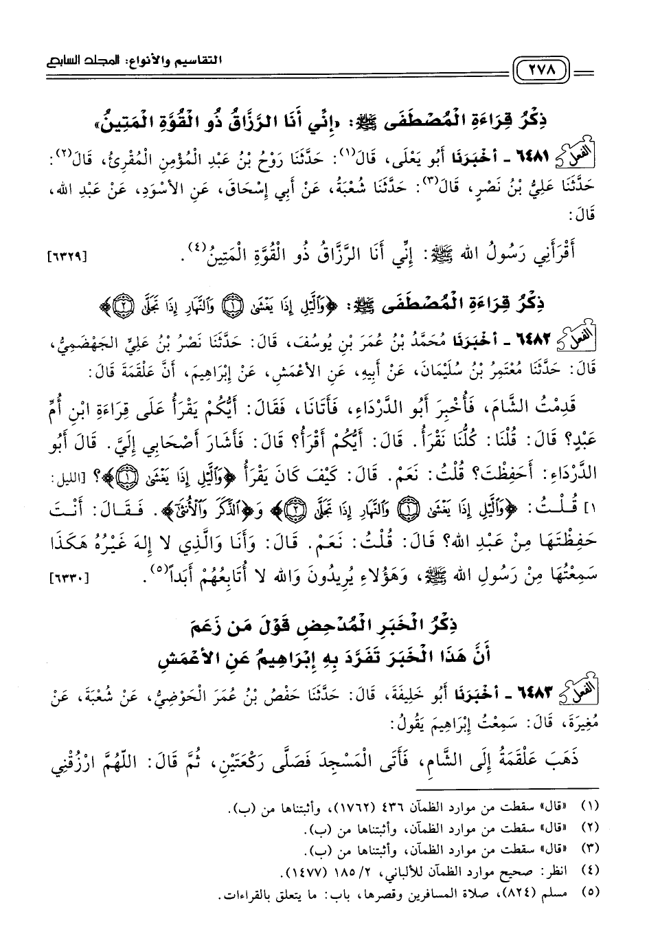 ٦٤٨٢ - أَخبَرنا مُحَمَّدُ بْنُ عُمَرَ بْنِ يُوسُفَ، قَالَ: حَدثنا نَصْرُ بْنُ عَلِيٍّ الْجَهْضَمِيُّ، قَالَ: حَدثنا مُعْتَمِرُ بْنُ سُلَيْمَانَ، عَنْ أَبِيهِ، عَنِ الأَعْمَشِ، عَنْ إِبْرَاهِيمَ، أَنَّ عَلْقَمَةَ قَالَ: قَدِمْتُ الشَّامَ، فَأُخْبِرَ أَبُو الدَّرْدَاءِ، فَأَتَانَا، فَقَالَ: أَيُّكُمْ يَقْرَأُ عَلَى قِرَاءَةِ ابْنِ أُمِّ عَبْدٍ؟ قَالَ: قُلْنَا: كُلُّنَا نَقْرَأُ، قَالَ: أَيُّكُمْ أَقْرَأُ؟ قَالَ: فَأَشَارَ أَصْحَابِي إِلَيَّ، قَالَ أَبُو الدَّرْدَاءِ: أَحَفِظْتَ؟ قُلْتُ: نَعَمْ، قَالَ: كَيْفَ كَانَ يَقْرَأُ: {وَاللَّيْلِ إِذَا يَغْشَى}؟ [الليل: ١] قُلْتُ: "وَاللَّيْلِ إِذَا يَغْشَى وَالنَّهَارِ إِذَا تَجَلَّى وَالذَّكَرِ وَالأُنْثَى"، فَقَالَ: أَنْتَ حَفِظْتَهَا مِنْ عَبْدِ اللهِ؟ قَالَ: قُلْتُ: نَعَمْ، قَالَ: وَأَنَا وَالَّذِي لَا إِلَهَ غَيْرُهُ هَكَذَا سَمِعْتُهَا مِنْ رَسُولِ اللهِ صَلى الله عَلَيه وسَلم، وَهَؤُلَاءِ يُرِيدُونَ وَاللهِ لَا أُتَابِعُهُمْ أَبَدًا. [٦٣٣٠]