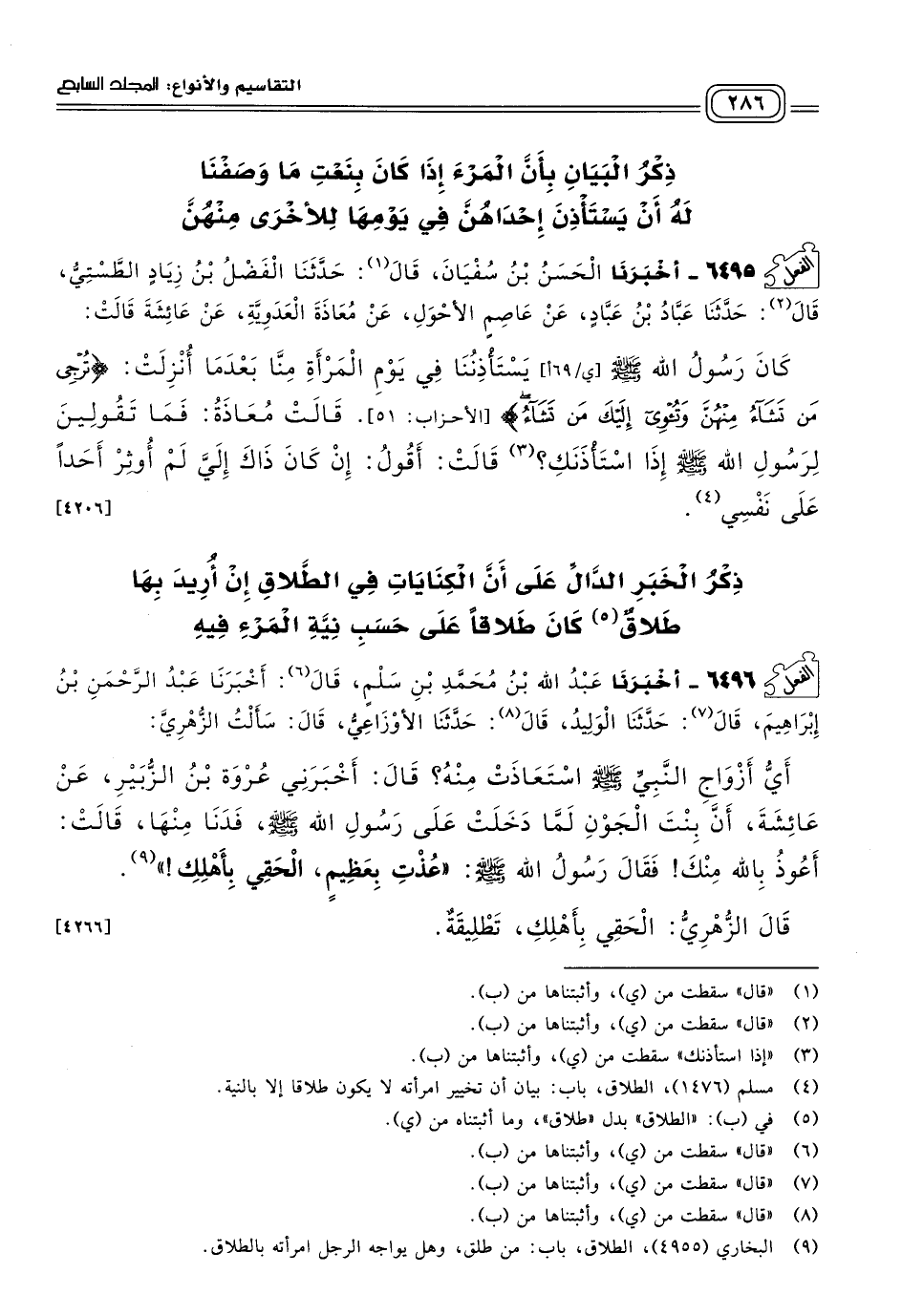 ٦٤٩٥ - أَخبَرنا الْحَسَنُ بْنُ سُفْيَانَ، قَالَ: حَدثنا الْفَضْلُ بْنُ زِيَادٍ الطَّسْتِيُّ، قَالَ: حَدثنا عَبَّادُ بْنُ عَبَّادٍ، عَنْ عَاصِمٍ الأَحْوَلِ، عَنْ مُعَاذَةَ الْعَدَوِيَّةِ، عَنْ عَائِشَةَ قَالَتْ: كَانَ رَسُولُ اللهِ صَلى الله عَلَيه وسَلم يَسْتَأْذِنُنَا فِي يَوْمِ الْمَرْأَةِ مِنَّا بَعْدَمَا أُنْزِلَتْ: {تُرْجِي مَنْ تَشَاءُ مِنْهُنَّ وَتُؤْوِي إِلَيْكَ مَنْ تَشَاءُ} [الأحزاب: ٥١]، قَالَتْ مُعَاذَةُ: فَمَا تَقُولِينَ لِرَسُولِ اللهِ صَلى الله عَلَيه وسَلم إِذَا اسْتَأْذَنَكِ؟ قَالَتْ: أَقُولُ: إِنْ كَانَ ذَاكَ إِلَيَّ لَمْ أُوثِرْ أَحَدًا عَلَى نَفْسِي. [٤٢٠٦]