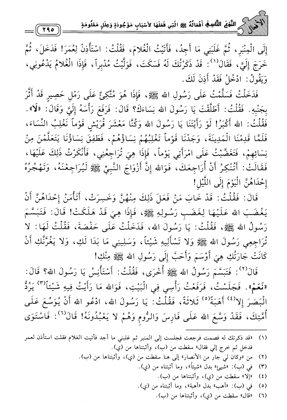 فَدَخَلْتُ فَسَلَّمْتُ عَلَى رَسُولِ اللهِ صَلى الله عَلَيه وسَلم، فَإِذَا هُوَ مُتَّكِئٌ عَلَى رَمْلِ حَصِيرٍ قَدْ أَثَّرَ بِجَنْبِهِ، فَقُلْتُ: أَطَلَّقْتَ يَا رَسُولَ اللهِ نِسَاءَكَ؟ قَالَ: فَرَفَعَ رَأْسَهُ إِلَيَّ وَقَالَ: "لَا"، فَقُلْتُ: اللهُ أَكْبَرُ! لَوْ رَأَيْتَنَا يَا رَسُولَ اللهِ وَكُنَّا مَعْشَرَ قُرَيْشٍ قَوْمًا نَغْلِبُ النِّسَاءَ، فَلَمَّا قَدِمْنَا الْمَدِينَةَ وَجَدْنَا قَوْمًا تَغْلِبُهُمْ نِسَاؤُهُمْ، فَطَفِقَ نِسَاؤُنَا يَتَعَلَّمْنَ مِنْ نِسَائِهِمْ، فَتَغَضَّبْتُ عَلَى امْرَأَتِي يَوْمًا، فَإِذَا هِيَ تُرَاجِعُنِي، فَأَنْكَرْتُ ذَلِكَ عَلَيْهَا، فَقَالَتْ: أَتُنْكِرُ أَنْ أُرَاجِعَكَ، فَوَاللهِ إِنَّ أَزْوَاجَ النَّبِيِّ صَلى الله عَلَيه وسَلم لَيُرَاجِعْنَهُ، وَتَهْجُرُهُ إِحْدَاهُنَّ الْيَوْمَ إِلَى اللَّيْلِ. قَالَ: فَقُلْتُ: قَدْ خَابَ مَنْ فَعَلَ ذَلِكَ مِنْهُنَّ وَخَسِرَتْ، أَتَأْمَنُ إِحْدَاهُنَّ أَنْ يَغْضَبَ اللهُ عَلَيْهَا لِغَضَبِ رَسُولِهِ صَلى الله عَلَيه وسَلم، فَإِذَا هِيَ قَدْ هَلَكَتْ، قَالَ: فَتَبَسَّمَ رَسُولُ اللهِ صَلى الله عَلَيه وسَلم، فَقُلْتُ: يَا رَسُولَ اللهِ، فَدَخَلْتُ عَلَى حَفْصَةَ، فَقُلْتُ لَهَا: لَا تُرَاجِعِي رَسُولَ اللهِ صَلى الله عَلَيه وسَلم وَلَا تَسْأَلِيهِ شَيْئًا، وَسَلِينِي مَا بَدَا لَكِ، وَلَا يَغُرَّنَّكِ أَنْ كَانَتْ جَارَتُكِ هِيَ أَوْسَمَ وَأَحَبَّ إِلَى رَسُولِ اللهِ صَلى الله عَلَيه وسَلم مِنْكِ، قَالَ: فَتَبَسَّمَ رَسُولُ اللهِ صَلى الله عَلَيه وسَلم أُخْرَى، فَقُلْتُ: أَسْتَأْنِسُ يَا رَسُولَ اللهِ؟ قَالَ: "نَعَمْ"، فَجَلَسْتُ، فَرَفَعْتُ رَأْسِي فِي الْبَيْتِ، فَوَاللهِ مَا رَأَيْتُ فِيهِ شَيْئًا يَرُدُّ الْبَصَرَ إِلَاّ أُهُبَةً ثَلَاثَةً،