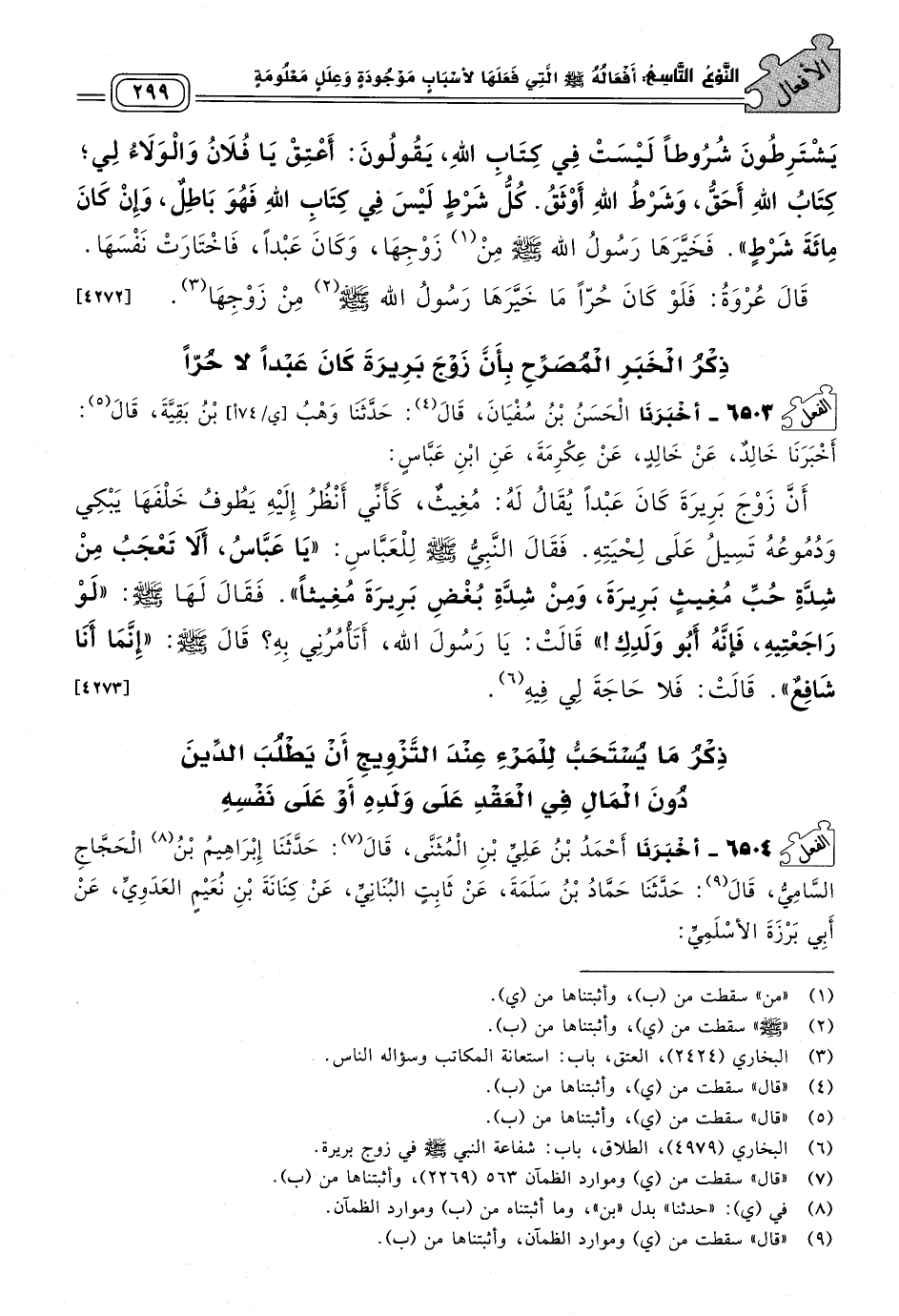 ٦٥٠٣ - أَخبَرنا الْحَسَنُ بْنُ سُفْيَانَ، قَالَ: حَدثنا وَهْبُ بْنُ بَقِيَّةَ، قَالَ: أَخبَرنا خَالِدٌ، عَنْ خَالِدٍ، عَنْ عِكْرِمَةَ، عَنِ ابْنِ عَبَّاسٍ، أَنَّ زَوْجَ بَرِيرَةَ كَانَ عَبْدًا يُقَالُ لَهُ: مُغِيثٌ، كَأَنِّي أَنْظُرُ إِلَيْهِ يَطُوفُ خَلْفَهَا يَبْكِي وَدُمُوعُهُ تَسِيلُ عَلَى لِحْيَتِهِ، فَقَالَ النَّبِيُّ صَلى الله عَلَيه وسَلم لِلْعَبَّاسِ: "يَا عَبَّاسُ، أَلَا تَعْجَبُ مِنْ شِدَّةِ حُبِّ مُغِيثٍ بَرِيرَةَ، وَمِنْ شِدَّةِ بُغْضِ بَرِيرَةَ مُغِيثًا"، فَقَالَ لَهَا صَلى الله عَلَيه وسَلم: "لَوْ رَاجَعْتِيهِ، فَإِنَّهُ أَبُو وَلَدِكِ"، قَالَتْ: يَا رَسُولَ اللهِ، أَتَأْمُرُنِي بِهِ؟ قَالَ صَلى الله عَلَيه وسَلم: "إِنَّمَا أَنَا شَافِعٌ"، قَالَتْ: فَلَا حَاجَةَ لِي فِيهِ. [٤٢٧٣]