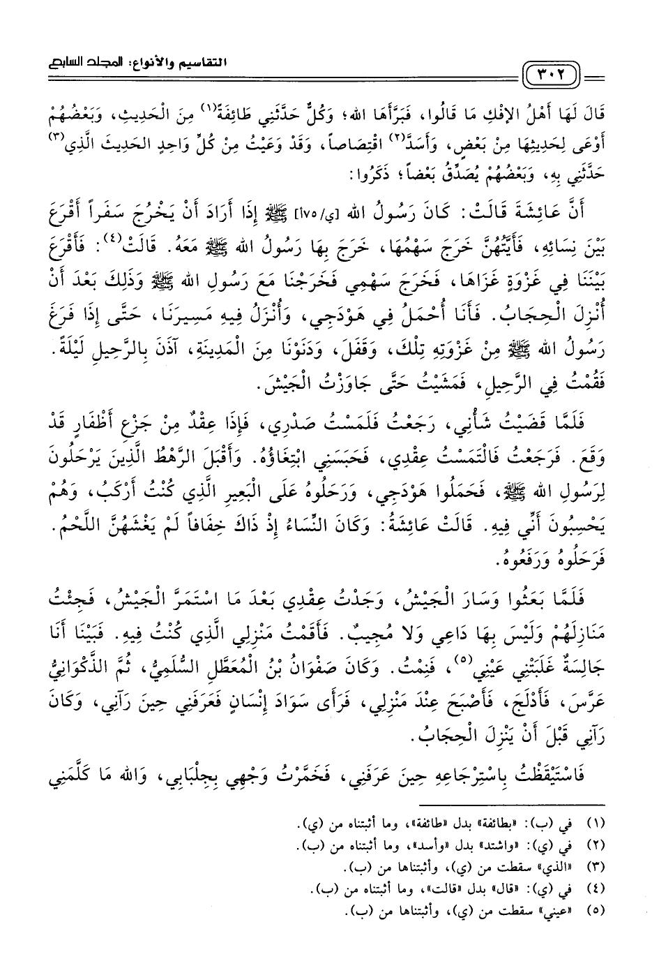 وَذَلِكَ بَعْدَ أَنْ أُنْزِلَ الْحِجَابُ، فَأَنَا أُحْمَلُ فِي هَوْدَجِي، وَأُنْزَلُ فِيهِ مَسِيرَنَا، حَتَّى إِذَا فَرَغَ رَسُولُ اللهِ صَلى الله عَلَيه وسَلم مِنْ غَزْوَتِهِ تِلْكَ، وَقَفَلَ، وَدَنَوْنَا مِنَ الْمَدِينَةِ، آذَنَ بِالرَّحِيلِ لَيْلَةً، فَقُمْتُ فِي الرَّحِيلِ، فَمَشَيْتُ حَتَّى جَاوَزْتُ الْجَيْشَ، فَلَمَّا قَضَيْتُ شَأْنِي، رَجَعْتُ فَلَمَسْتُ صَدْرِي، فَإِذَا عِقْدٌ مِنْ جَزْعِ أَظْفَارٍ قَدْ وَقَعَ. فَرَجَعْتُ فَالْتَمَسْتُ عِقْدِي، فَحَبَسَنِي ابْتِغَاؤُهُ، وَأَقْبَلَ الرَّهْطُ الَّذِينَ يَرْحَلُونَ لِرَسُولِ اللهِ صَلى الله عَلَيه وسَلم، فَحَمَلُوا هَوْدَجِي وَرَحَلُوهُ عَلَى الْبَعِيرِ الَّذِي كُنْتُ أَرْكَبُ، وَهُمْ يَحْسِبُونَ أَنِّي فِيهِ، قَالَتْ عَائِشَةُ: وَكَانَ النِّسَاءُ إِذْ ذَاكَ خِفَافًا لَمْ يَغْشَهُنَّ اللَّحْمُ، فَرَحَلُوهُ وَرَفَعُوهُ، فَلَمَّا بَعَثُوا وَسَارَ الْجَيْشُ، وَجَدْتُ عِقْدِي بَعْدَ مَا اسْتَمَرَّ الْجَيْشُ، فَجِئْتُ مَنَازِلَهُمْ وَلَيْسَ بِهَا دَاعِي وَلَا مُجِيبٌ، فَأَقَمْتُ مَنْزِلِي الَّذِي كُنْتُ فِيهِ، فَبَيْنَا أَنَا جَالِسَةٌ غَلَبَتْنِي عَيْنِي فَنِمْتُ،