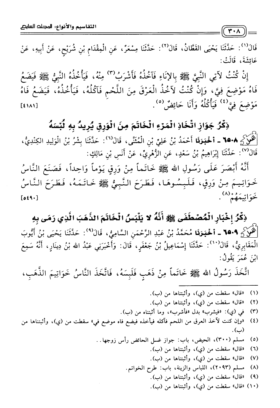 ٦٥٠٨ - أَخبَرنا أَحْمَدُ بْنُ عَلِيِّ بْنِ الْمُثَنَّى، قَالَ: حَدثنا بِشْرُ بْنُ الْوَلِيدِ الْكِنْدِيُّ، قَالَ: حَدثنا إِبْرَاهِيمُ بْنُ سَعْدٍ، عَنِ الزُّهْرِيِّ، عَنْ أَنَسِ بْنِ مَالِكٍ، أَنَّهُ أَبْصَرَ عَلَى رَسُولِ اللهِ صَلى الله عَلَيه وسَلم خَاتَمًا مِنْ وَرِقٍ يَوْمًا وَاحِدًا، فَصَنَعَ النَّاسُ خَوَاتِيمَ مِنْ وَرِقٍ، فَلَبِسُوهَا، فَطَرَحَ النَّبِيُّ صَلى الله عَلَيه وسَلم خَاتَمَهُ، فَطَرَحَ النَّاسُ خَوَاتِيمَهُمْ. [٥٤٩٠]