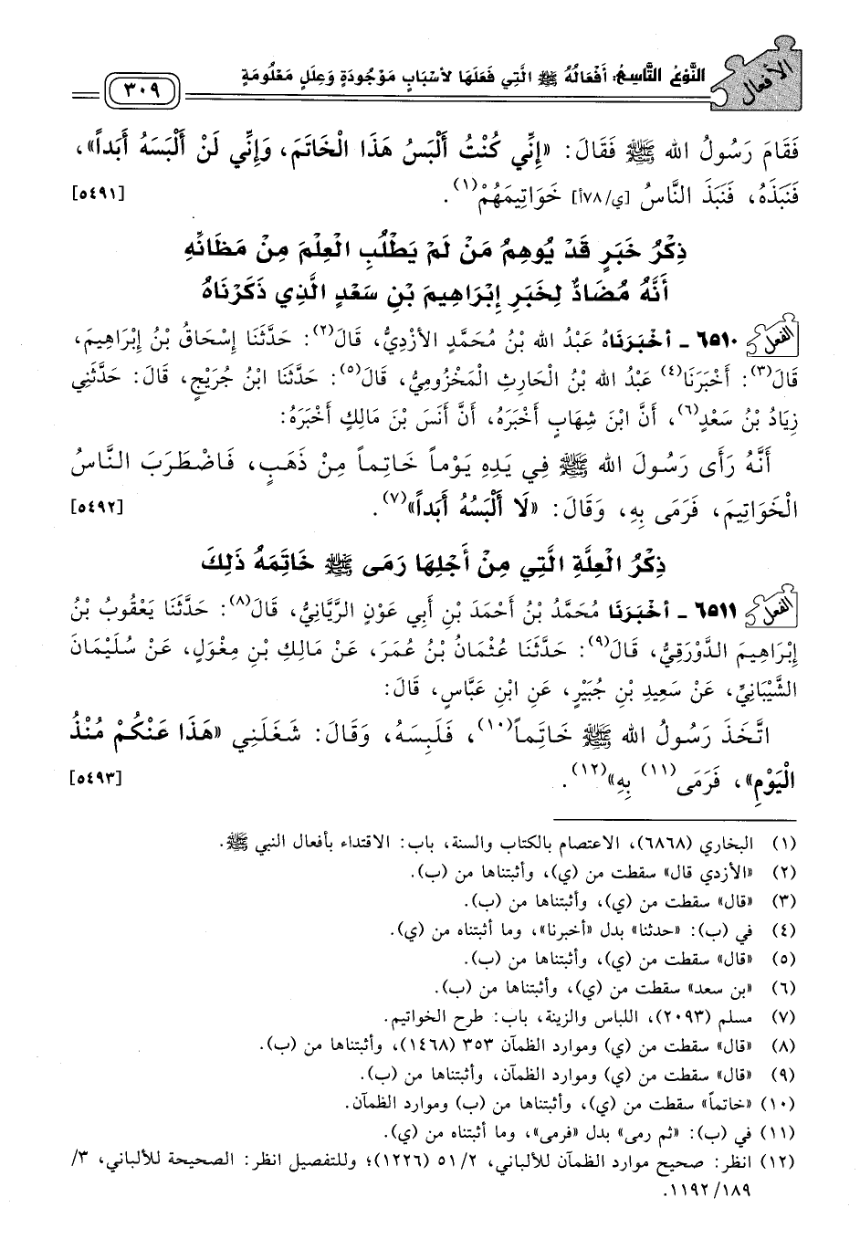 ٦٥١١ - أَخبَرنا مُحَمَّدُ بْنُ أَحْمَدَ بْنِ أَبِي عَوْنٍ الرَّيَّانِيُّ، قَالَ: حَدثنا يَعْقُوبُ بْنُ إِبْرَاهِيمَ الدَّوْرَقِيُّ، قَالَ: حَدثنا عُثْمَانُ بْنُ عُمَرَ، عَنْ مَالِكِ بْنِ مِغْوَلٍ، عَنْ سُلَيْمَانَ الشَّيْبَانِيِّ، عَنْ سَعِيدِ بْنِ جُبَيْرٍ، عَنِ ابْنِ عَبَّاسٍ، قَالَ: اتَّخَذَ رَسُولُ اللهِ صَلى الله عَلَيه وسَلم خَاتَمًا فَلَبِسَهُ، وَقَالَ: "شَغَلَنِي هَذَا عَنْكُمْ مُنْذُ الْيَوْمِ"، فَرَمَى بِهِ. [٥٤٩٣]