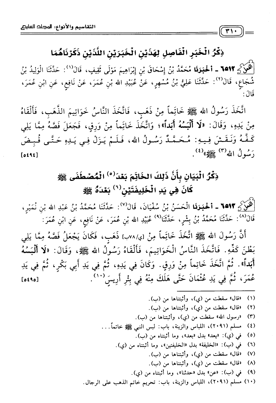 ٦٥١٣ - أَخبَرنا الْحَسَنُ بْنُ سُفْيَانَ، قَالَ: حَدثنا مُحَمَّدُ بْنُ عَبْدِ اللهِ بْنِ نُمَيْرٍ، قَالَ: حَدثنا مُحَمَّدُ بْنُ بِشْرٍ، حَدثنا عُبَيْدُ اللهِ بْنُ عُمَرَ، عَنْ نَافِعٍ، عَنِ ابْنِ عُمَرَ، أَنَّ رَسُولَ اللهِ صَلى الله عَلَيه وسَلم اتَّخَذَ خَاتَمًا مِنْ ذَهَبٍ، فَكَانَ يَجْعَلُ فَصَّهُ مِمَّا يَلِي بَطْنَ كَفِّهِ، فَاتَّخَذَ النَّاسُ الْخَوَاتِيمَ، فَأَلْقَاهُ رَسُولُ اللهِ صَلى الله عَلَيه وسَلم، وَقَالَ: "لَا أَلْبَسُهُ أَبَدًا"، ثُمَّ اتَّخَذَ خَاتَمًا مِنْ وَرِقٍ، وَكَانَ فِي يَدِهِ، ثُمَّ فِي يَدِ أَبِي بَكْرٍ، ثُمَّ فِي يَدِ عُمَرَ، ثُمَّ فِي يَدِ عُثْمَانَ حَتَّى هَلَكَ مِنْهُ فِي بِئْرِ أَرِيسٍ. [٥٤٩٥]
