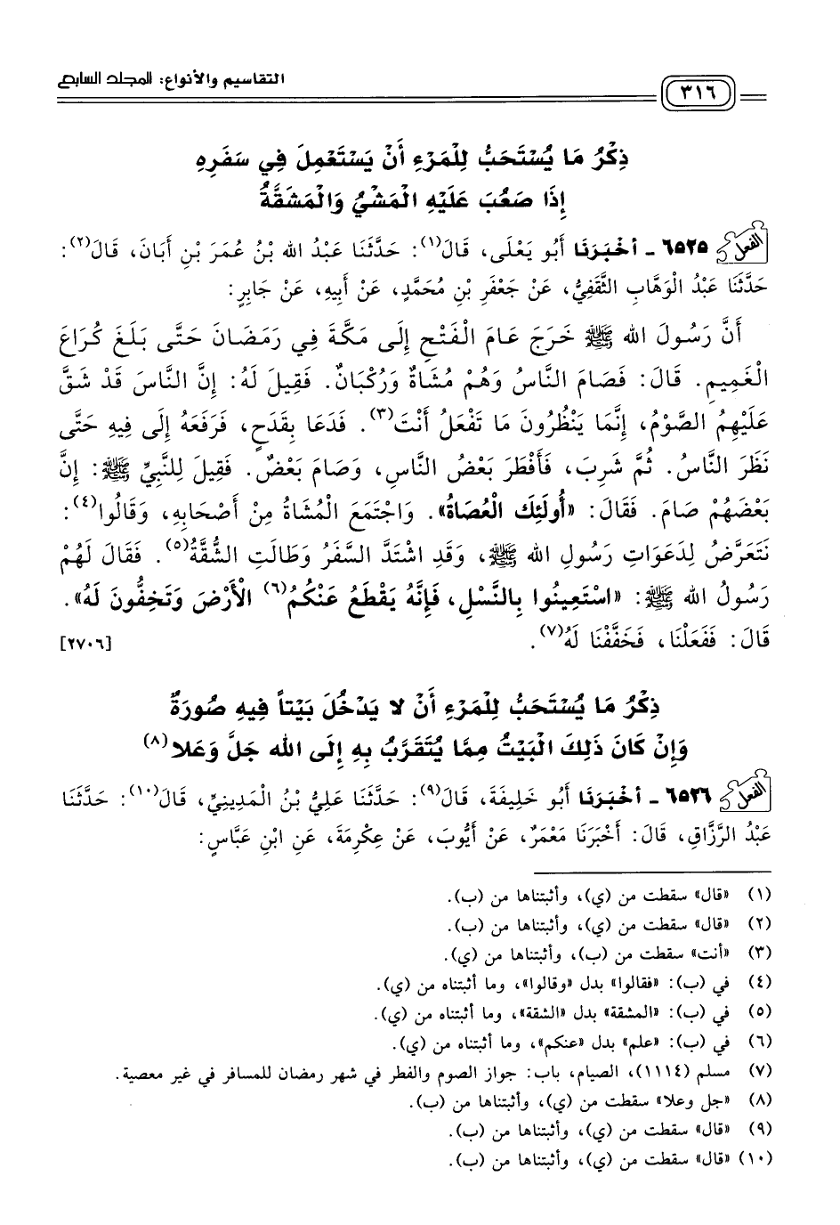 ٦٥٢٥ - أَخبَرنا أَبُو يَعْلَى، قَالَ: حَدثنا عَبْدُ اللهِ بْنُ عُمَرَ بْنِ أَبَانَ، قَالَ: حَدثنا عَبْدُ الْوَهَّابِ الثَّقَفِيُّ، عَنْ جَعْفَرِ بْنِ مُحَمَّدٍ، عَنْ أَبِيهِ، عَنْ جَابِرٍ، أَنَّ رَسُولَ اللهِ صَلى الله عَلَيه وسَلم خَرَجَ عَامَ الْفَتْحِ إِلَى مَكَّةَ فِي رَمَضَانَ حَتَّى بَلَغَ كُرَاعَ الْغَمِيمِ، قَالَ: فَصَامَ النَّاسُ وَهُمْ مُشَاةٌ وَرُكْبَانٌ، فَقِيلَ لَهُ: إِنَّ النَّاسَ قَدْ شَقَّ عَلَيْهِمُ الصَّوْمُ، إِنَّمَا يَنْظُرُونَ مَا تَفْعَلُ أَنْتَ، فَدَعَا بِقَدَحٍ، فَرَفَعَهُ إِلَى فِيهِ حَتَّى نَظَرَ النَّاسُ، ثُمَّ شَرِبَ، فَأَفْطَرَ بَعْضُ النَّاسِ وَصَامَ بَعْضٌ، فَقِيلَ لِلنَّبِيِّ صَلى الله عَلَيه وسَلم: إِنَّ بَعْضَهُمْ صَامَ، فَقَالَ: "أُولَئِكَ الْعُصَاةُ". وَاجْتَمَعَ الْمُشَاةُ مِنْ أَصْحَابِهِ، وَقَالُوا: نَتَعَرَّضُ لِدَعَوَاتِ رَسُولِ اللهِ صَلى الله عَلَيه وسَلم، وَقَدِ اشْتَدَّ السَّفَرُ وَطَالَتِ الشُقَّةُ، فَقَالَ لَهُمْ رَسُولُ اللهِ صَلى الله عَلَيه وسَلم: "اسْتَعِينُوا بِالنَّسْلِ، فَإِنَّهُ يَقْطَعُ عَنْكُمُ الأَرْضَ وَتَخِفُّونَ لَهُ"، قَالَ: فَفَعَلْنَا، فَخَفَّفْنَا لَهُ. [٢٧٠٦]