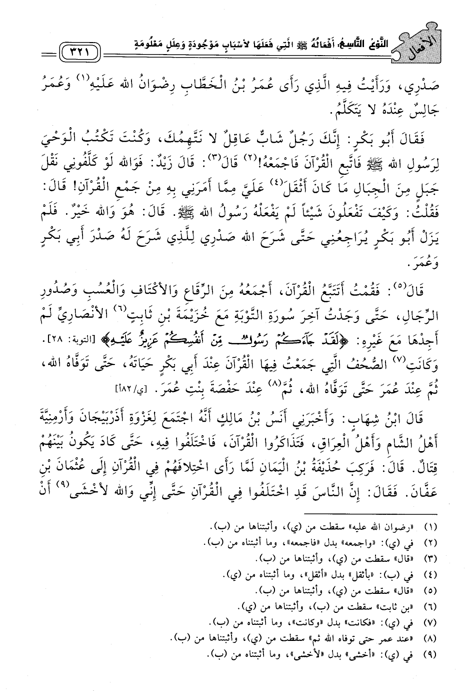 قَالَ: فَقُمْتُ أَتَتَبَّعُ الْقُرْآنَ، أَجْمَعُهُ مِنَ الرِّقَاعِ وَالأَكْتَافِ وَالْعُسُبِ وَصُدُورِ الرِّجَالِ، حَتَّى وَجَدْتُ آخِرَ سُورَةِ التَّوْبَةِ مَعَ خُزَيْمَةَ بْنِ ثَابِتٍ الأَنْصَارِيِّ لَمْ أَجِدْهَا مَعَ غَيْرِهِ: {لَقَدْ جَاءَكُمْ رَسُولٌ مِنْ أَنْفُسِكُمْ عَزِيزٌ عَلَيْهِ} [التوبة: ١٢٨]، وَكَانَتِ الصُّحُفُ الَّتِي جَمَعْتُ فِيهَا الْقُرْآنَ عِنْدَ أَبِي بَكْرٍ حَيَاتَهُ، حَتَّى تَوَفَّاهُ اللهُ، ثُمَّ عِنْدَ عُمَرَ حَتَّى تَوَفَّاهُ اللهُ، ثُمَّ عِنْدَ حَفْصَةَ بِنْتِ عُمَرَ.