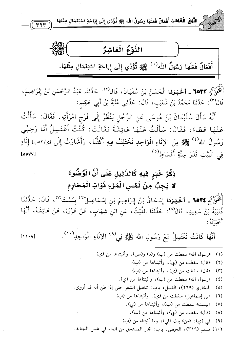 ٦٥٣٣ - أَخبَرنا الْحَسَنُ بْنُ سُفْيَانَ، قَالَ: حَدثنا عَبْدُ الرَّحْمَنِ بْنُ إِبْرَاهِيمَ، قَالَ: حَدثنا مُحَمَّدُ بْنُ شُعَيْبٍ، قَالَ: حَدَّثَنِي عُتْبَةُ بْنُ أَبِي حَكِيمٍ، أَنَّهُ سَأَلَ سُلَيْمَانَ بْنَ مُوسَى عَنِ الرَّجُلِ يَنْظُرُ إِلَى فَرْجِ امْرَأَتِهِ، فَقَالَ: سَأَلْتُ عَنْهَا عَطَاءً، فَقَالَ: سَأَلْتُ عَنْهَا عَائِشَةَ فَقَالَتْ: كُنْتُ أَغْتَسِلُ أَنَا وَحِبِّي رَسُولُ الله صَلى الله عَلَيه وسَلم مِنَ الإِنَاءِ الْوَاحِدِ تَخْتَلِفُ فِيهِ أَكُفُّنَا، وَأَشَارَتْ إِلَى إِنَاءٍ فِي الْبَيْتِ قَدْرَ سِتَّةِ أَقْسَاطٍ. [٥٥٧٧]