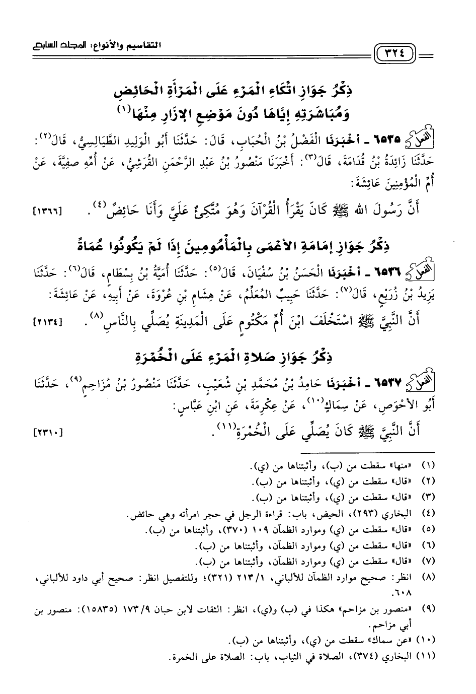 ٦٥٣٥ - أَخبَرنا الْفَضْلُ بْنُ الْحُبَابِ، قَالَ: حَدثنا أَبُو الْوَلِيدِ الطَّيَالِسِيُّ، قَالَ: حَدثنا زَائِدَةُ بْنُ قُدَامَةَ، قَالَ: أَخبَرنا مَنْصُورُ بْنُ عَبْدِ الرَّحْمَنِ الْقُرَشِيُّ، عَنْ أُمِّهِ صَفِيَّةَ، عَنْ أُمِّ الْمُؤْمِنِينَ عَائِشَةَ؛ أَنَّ رَسُولَ اللهِ صَلى الله عَلَيه وسَلم كَانَ يَقْرَأُ الْقُرْآنَ وَهُوَ مُتَّكِئٌ عَلَيَّ وَأَنَا حَائِضٌ. [١٣٦٦]