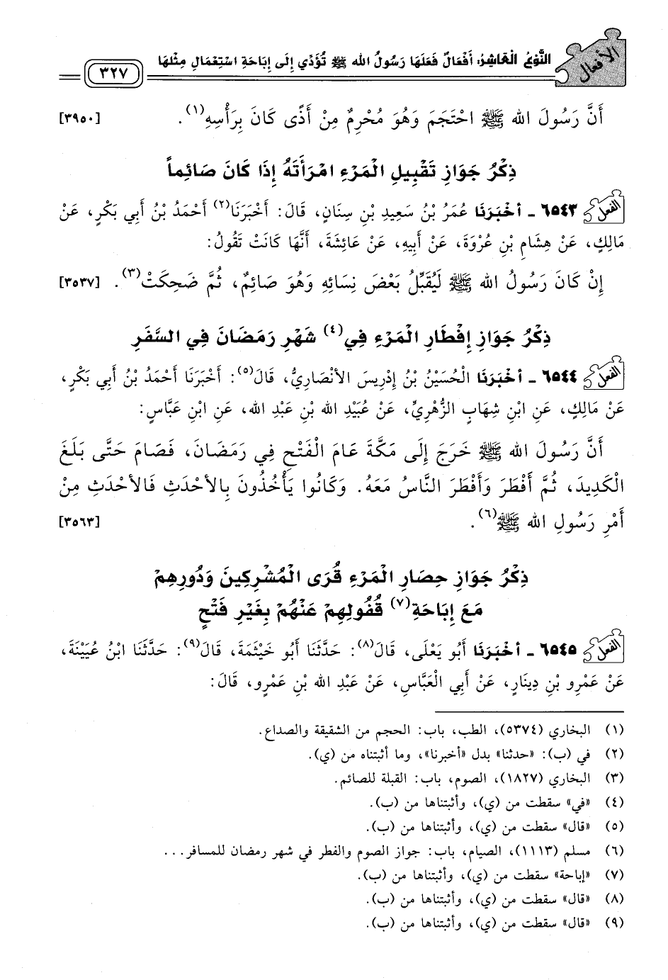 ٦٥٤٣ - أَخبَرنا عُمَرُ بْنُ سَعِيدِ بْنِ سِنَانٍ، قَالَ: أخبرنا أَحْمَدُ بْنُ أَبِي بَكْرٍ، عَنْ مَالِكٍ، عَنْ هِشَامِ بْنِ عُرْوَةَ، عَنْ أَبِيهِ، عَنْ عَائِشَةَ، أَنَّهَا كَانَتْ تَقُولُ: إِنْ كَانَ رَسُولُ اللهِ صَلى الله عَلَيه وسَلم لَيُقَبِّلُ بَعْضَ نِسَائِهِ وَهُوَ صَائِمٌ، ثُمَّ ضَحِكَتْ. [٣٥٣٧]