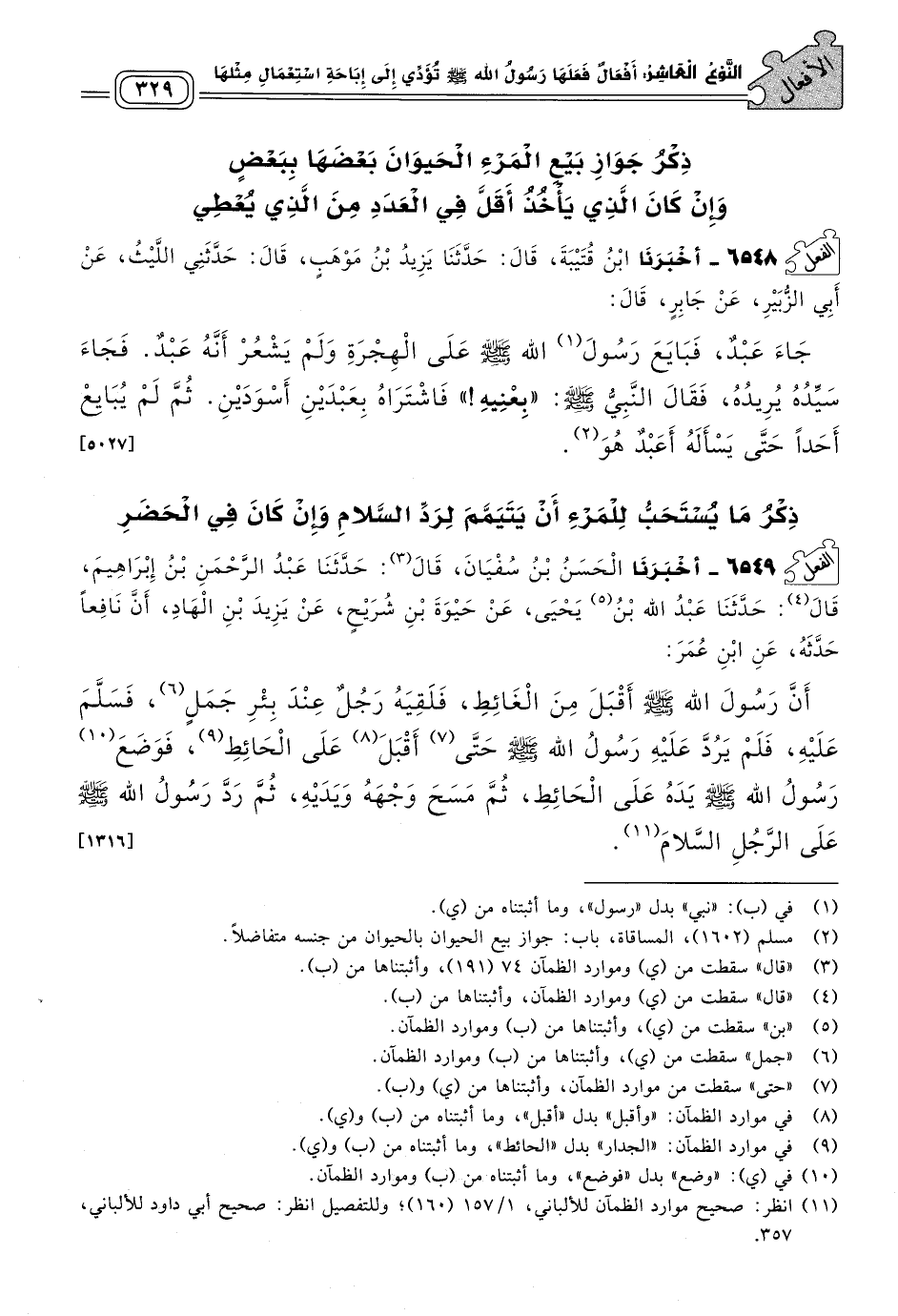 ٦٥٤٩ - أَخبَرنا الْحَسَنُ بْنُ سُفْيَانَ، قَالَ: حَدثنا عَبْدُ الرَّحْمَنِ بْنُ إِبْرَاهِيمَ، قَالَ: حَدثنا عَبْدُ اللهِ بْنُ يَحْيَى، عَنْ حَيْوَةَ بْنِ شُرَيْحٍ، عَنْ يَزِيدَ بْنِ الْهَادِ، أَنَّ نَافِعًا حَدَّثَهُ، عَنِ ابْنِ عُمَرَ؛ أَنَّ رَسُولَ اللهِ صَلى الله عَلَيه وسَلم أَقْبَلَ مِنَ الْغَائِطِ، فَلَقِيَهُ رَجُلٌ عِنْدَ بِئْرِ جَمَلٍ، فَسَلَّمَ عَلَيْهِ، فَلَمْ يَرُدَّ عَلَيْهِ رَسُولُ اللهِ صَلى الله عَلَيه وسَلم حَتَّى أَقْبَلَ عَلَى الْحَائِطِ، فَوَضَعَ رَسُولُ اللهِ صَلى الله عَلَيه وسَلم يَدَهُ عَلَى الْحَائِطِ، ثُمَّ مَسَحَ وَجْهَهُ وَيَدَيْهِ، ثُمَّ رَدَّ رَسُولُ اللهِ صَلى الله عَلَيه وسَلم عَلَى الرَّجُلِ السَّلَامَ. [١٣١٦]