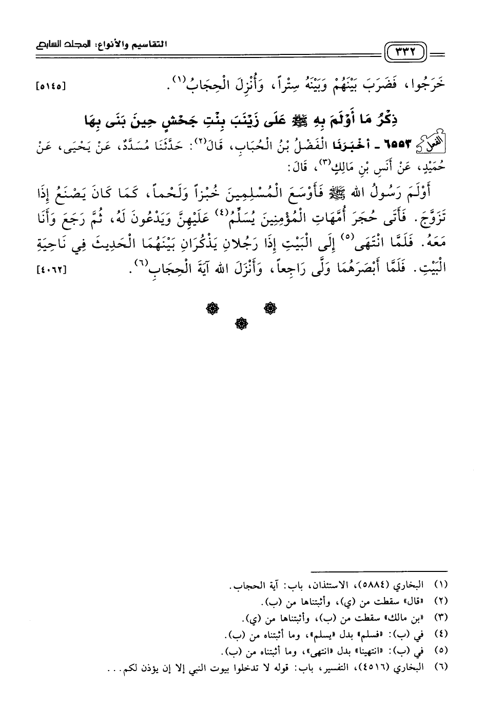 ٦٥٥٣ - أَخبَرنا الْفَضْلُ بْنُ الْحُبَابِ، قَالَ: حَدثنا مُسَدَّدٌ، عَنْ يَحْيَى، عَنْ حُمَيْدٍ، عَنْ أَنَسِ بْنِ مَالِكٍ، قَالَ: أَوْلَمَ رَسُولُ اللهِ صَلى الله عَلَيه وسَلم فَأَوْسَعَ الْمُسْلِمِينَ خُبْزًا وَلَحْمًا، كَمَا كَانَ يَصْنَعُ إِذَا تَزَوَّجَ، فَأَتَى حُجَرَ أُمَّهَاتِ الْمُؤْمِنِينَ يُسَلِّمُ عَلَيْهِنَّ وَيَدْعُونَ لَهُ، ثُمَّ رَجَعَ وَأَنَا مَعَهُ، فَلَمَّا انْتَهَى إِلَى الْبَيْتِ إِذَا رَجُلَانِ يَذْكُرَانِ بَيْنَهُمَا الْحَدِيثَ فِي نَاحِيَةِ الْبَيْتِ، فَلَمَّا أَبْصَرَهُمَا وَلَّى رَاجِعًا، وَأَنْزَلَ اللهُ آيَةَ الْحِجَابِ. [٤٠٦٢]