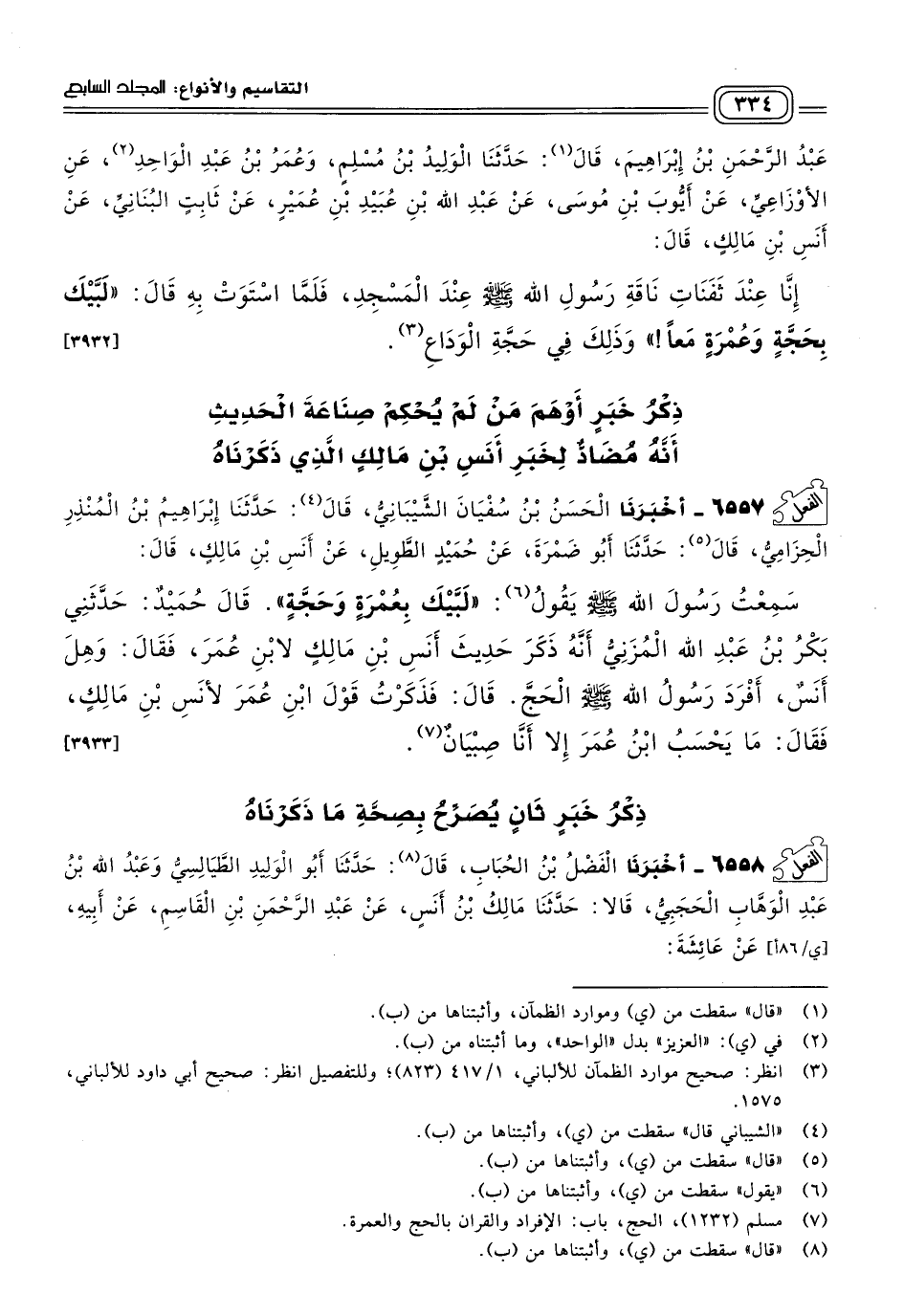 قَالَ حُمَيْدٌ: حَدَّثَنِي بَكْرُ بْنُ عَبْدِ اللهِ الْمُزَنِيُّ، أَنَّهُ ذَكَرَ حَدِيثَ أَنَسِ بْنِ مَالِكٍ لاِبْنِ عُمَرَ، فَقَالَ: وَهِلَ أَنَسٌ، أَفْرَدَ رَسُولُ اللهِ صَلى الله عَلَيه وسَلم الْحَجَّ، قَالَ: فَذَكَرْتُ قَوْلَ ابْنِ عُمَرَ لأَنَسِ بْنِ مَالِكٍ، فَقَالَ: مَا يَحْسَبُ ابْنُ عُمَرَ إِلَاّ أَنَّا صِبْيَانٌ. [٣٩٣٣]