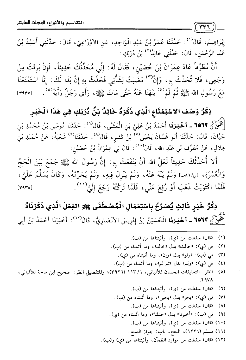 ٦٥٦٢ - أَخبَرنا أَحْمَدُ بْنُ عَلِيِّ بْنِ الْمُثَنَّى، قَالَ: حَدثنا مُوسَى بْنُ مُحَمَّدِ بْنِ حَيَّانَ، قَالَ: حَدثنا أَبُو غَسَّانَ يَحْيَى بْنُ كَثِيرٍ، قَالَ: حدثنا شُعْبَةُ، عَنْ حُمَيْدِ بْنِ هِلَالٍ، عَنْ مُطَرِّفِ بْنِ عَبْدِ اللهِ، قَالَ: قَالَ لِي عِمْرَانُ بْنُ حُصَيْنٍ: أَلَا أُحَدِّثُكَ حَدِيثًا لَعَلَّ اللهَ أَنْ يَنْفَعَكَ بِهِ: إِنَّ رَسُولَ اللهِ صَلى الله عَلَيه وسَلم جَمَعَ بَيْنَ الْحَجِّ وَالْعُمْرَةِ، وَلَمْ يَنْهَ عَنْهُ، وَلَمْ يَنْزِلْ فِيهِ، وَلَمْ يُحَرِّمْهُ، وَكَانَ يُسَلِّمُ عَلَيَّ، فَلَمَّا اكْتَوَيْتُ ذَهَبَ، أَوْ رُفِعَ عَنِّي، فَلَمَّا تَرَكْتُهُ رَجَعَ إِلَيَّ. [٣٩٣٨]