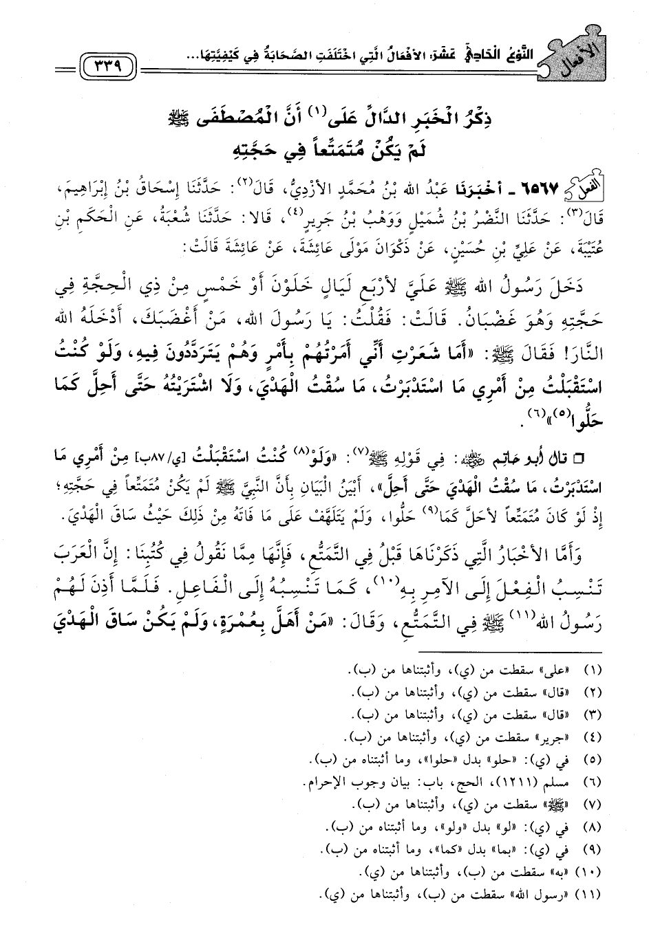 وَأَمَّا الأَخْبَارُ الَّتِي ذَكَرْنَاهَا قَبْلُ فِي التَّمَتُّعِ، فَإِنَّهَا مِمَّا نَقُولُ فِي كُتُبِنَا: إِنَّ الْعَرَبَ تَنْسِبُ الْفِعْلَ إِلَى الآمِرِ به، كَمَا تَنْسِبُهُ إِلَى الْفَاعِلِ، فَلَمَّا أَذِنَ لَهُمْ رسول الله صَلى الله عَلَيه وسَلم فِي التَّمَتُّعِ، وَقَالَ: "مَنْ أَهَلَّ بِعُمْرَةٍ وَلَمْ يَكُنْ سَاقَ الْهَدْيَ فَلْيَحِلَّ"، كَانَ فِيهِ إِبَاحَةُ التَّمَتُّعِ لِمَنْ شَاءَ، فَنُسِبَ هَذَا الْفِعْلُ إِلَى الْمُصْطَفَى صَلى الله عَلَيه وسَلم عَلَى سَبِيلِ الأَمْرِ بِهِ، لَا أَنَّهُ صَلى الله عَلَيه وسَلم كَانَ مُتَمَتِّعًا، وَلِذَلِكَ قَالَ عُمَرُ بْنُ الْخَطَّابِ لِلصُّبَيِّ بْنِ مَعْبَدٍ حَيْثُ أَخْبَرَهُ أَنَّهُ أَهَلَّ بِالْحَجِّ وَالْعُمْرَةِ، فَقَالَ: هُدِيتَ لِسُنَّةِ نَبِيِّكَ صَلى الله عَلَيه وسَلم. [٣٩٤١]