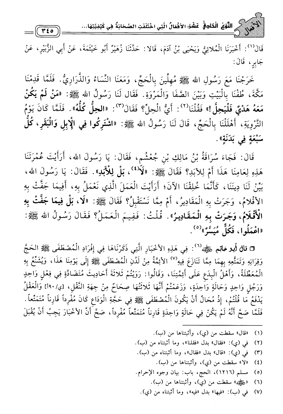 قال أبو حاتم رَضِيَ اللهُ عَنْهُ: فِي هَذِهِ الأَخْبَارِ الَّتِي ذَكَرْنَاهَا فِي إِفْرَادِ الْمُصْطَفَى صَلى الله عَلَيه وسَلم الْحَجَّ وَقِرَانِهِ وَتَمَتُّعِهِ بِهِمَا مِمَّا تَنَازَعَ فِيهِ الأَئِمَّةُ مِنْ لَدُنِ الْمُصْطَفَى صَلى الله عَلَيه وسَلم إِلَى يَوْمِنَا هَذَا، وَيُشَنِّعُ بِهِ الْمُعَطِّلَةُ، وَأَهْلُ الْبِدَعِ عَلَى أَئِمَّتِنَا، وَقَالُوا: رَوَيْتُمْ ثَلَاثَةَ أَحَادِيثَ مُتَضَادَّةٍ فِي فِعْلٍ وَاحِدٍ، وَرَجُلٍ وَاحِدٍ، وَحَالَةٍ وَاحِدَةٍ، وَزَعَمْتُمْ أَنَّهَا ثَلَاثَتُهَا صِحَاحٌ مِنْ جِهَةِ النَّقْلِ، وَالْعَقْلُ يَدْفَعُ مَا قُلْتُمْ، إِذْ مُحَالٌ أَنَّ يَكُونَ الْمُصْطَفَى صَلى الله عَلَيه وسَلم فِي حَجَّةِ الْوَدَاعِ كَانَ مُفْرَدًا قَارِنًا مُتَمَتِّعًا،