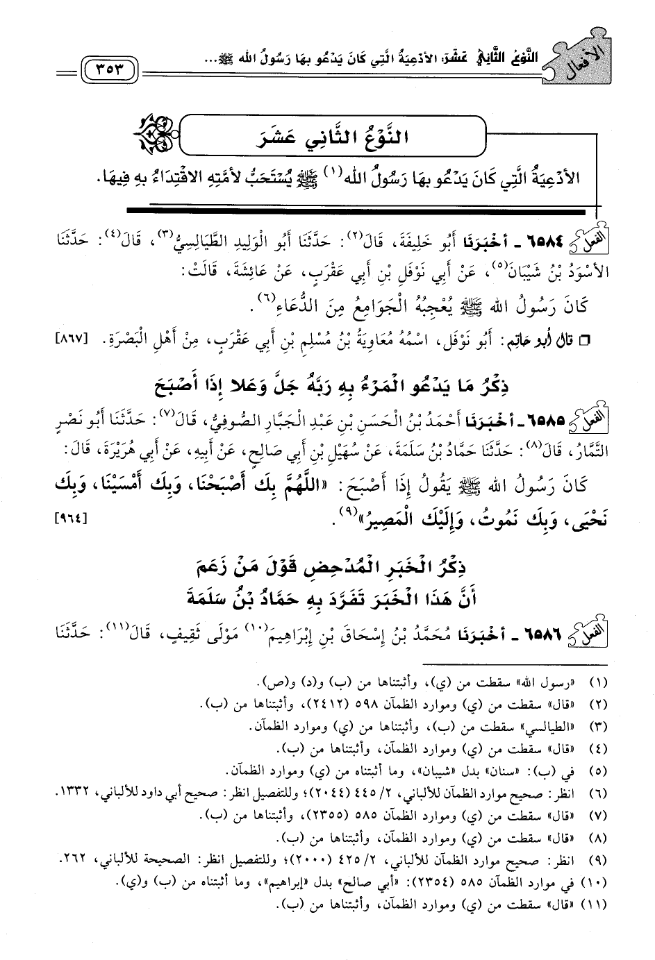 ٦٥٨٥ - أَخبَرنا أَحْمَدُ بْنُ الْحَسَنِ بْنِ عَبْدِ الْجَبَّارِ الصُّوفِيُّ، قَالَ: حَدثنا أَبُو نَصْرٍ التَّمَّارُ، قَالَ: حَدثنا حَمَّادُ بْنُ سَلَمَةَ، عَنْ سُهَيْلِ بْنِ أَبِي صَالِحٍ، عَنْ أَبِيهِ، عَنْ أَبِي هُرَيْرَةَ، قَالَ: كَانَ رَسُولُ اللهِ صَلى الله عَلَيه وسَلم يَقُولُ إِذَا أَصْبَحَ: "اللهُمَّ بِكَ أَصْبَحْنَا، وَبِكَ أَمْسَيْنَا، وَبِكَ نَحْيَى، وَبِكَ نَمُوتُ، وَإِلَيْكَ الْمَصِيرُ". [٩٦٤]