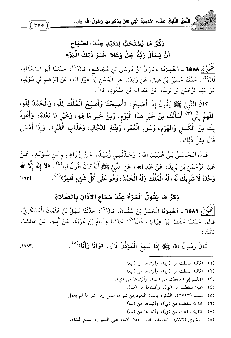 ٦٥٨٨ - أَخبَرنا عِمْرَانُ بْنُ مُوسَى بْنِ مُجَاشِعٍ، قَالَ: حَدثنا أَبُو الشَّعْثَاءِ، قَالَ: حَدثنا حُسَيْنُ بْنُ عَلِيٍّ، عَنْ زَائِدَةَ، عَنِ الْحَسَنِ بْنِ عُبَيْدِ اللهِ، عَنْ إِبْرَاهِيمَ بْنِ سُوَيْدٍ، عَنْ عَبْدِ الرَّحْمَنِ بْنِ يَزِيدَ، عَنْ عَبْدِ اللهِ بْنِ مَسْعُودٍ، قَالَ: كَانَ النَّبِيُّ صَلى الله عَلَيه وسَلم يَقُولُ إِذَا أَصْبَحَ: "أَصْبَحْنَا وَأَصْبَحَ الْمُلْكُ للهِ، وَالْحَمْدُ للهِ، اللهم إني أَسْأَلُكَ مِنْ خَيْرِ هَذَا الْيَوْمِ، وَمِنْ خَيْرِ مَا فِيهِ، وَخَيْرِ مَا بَعْدَهُ. وَأَعُوذُ بِكَ مِنَ الْكَسَلِ وَالْهَرَمِ، وَسُوءِ الْعُمُرِ، وَفِتْنَةِ الدَّجَّالِ، وَعَذَابِ الْقَبْرِ"، وَإِذَا أَمْسَى قَالَ مِثْلَ ذَلِكَ.
