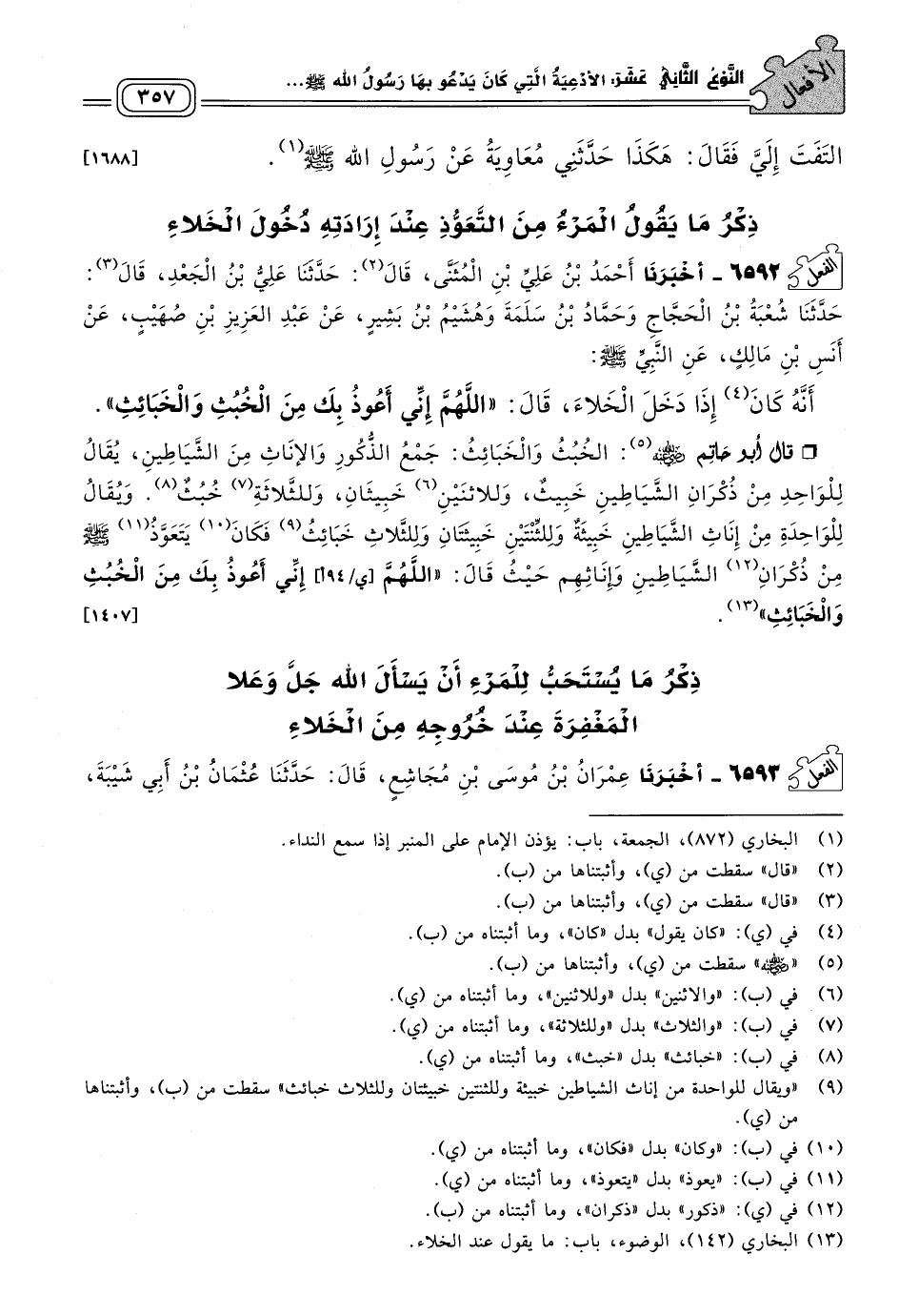 ٦٥٩٢ - أَخبَرنا أَحْمَدُ بْنُ عَلِيِّ بْنِ الْمُثَنَّى، قَالَ: حَدثنا عَلِيُّ بْنُ الْجَعْدِ، قَالَ: حَدثنا شُعْبَةُ بْنُ الْحَجَّاجِ، وَحَمَّادُ بْنُ سَلَمَةَ، وَهُشَيْمُ بْنُ بَشِيرٍ، عَنْ عَبْدِ الْعَزِيزِ بْنِ صُهَيْبٍ، عَنْ أَنَسِ بْنِ مَالِكٍ، عَنِ النَّبِيِّ صَلى الله عَلَيه وسَلم، أَنَّهُ كَانَ إِذَا دَخَلَ الْخَلَاءَ، قَالَ: "اللهُمَّ إِنِّي أَعُوذُ بِكَ مِنَ الْخُبُثِ وَالْخَبَائِثِ".