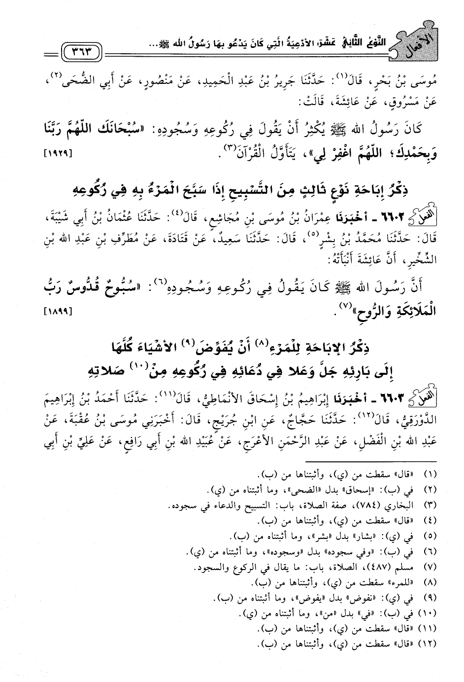 ٦٦٠٣ - أَخبَرنا إِبْرَاهِيمُ بْنُ إِسْحَاقَ الأَنْمَاطِيُّ، قَالَ: حَدثنا أَحْمَدُ بْنُ إِبْرَاهِيمَ الدَّوْرَقِيُّ، قَالَ: حَدثنا حَجَّاجٌ، عَنِ ابْنِ جُرَيْجٍ، قَالَ: أَخْبَرَنِي مُوسَى بْنُ عُقْبَةَ، عَنْ عَبْدِ اللهِ بْنِ الْفَضْلِ، عَنْ عَبْدِ الرَّحْمَنِ الأَعْرَجِ، عَنْ عُبَيْدِ اللهِ بْنِ أَبِي رَافِعٍ، عَنْ عَلِيِّ بْنِ أَبِي طَالِبٍ رضوان الله عليه، أَنَّ النَّبِيَّ صَلى الله عَلَيه وسَلم كَانَ إِذَا رَكَعَ قَالَ: "اللهُمَّ لَكَ رَكَعْتُ، وَبِكَ آمَنْتُ، وَلَكَ أَسْلَمْتُ، أَنْتَ رَبِّي، خَشَعَ سَمْعِي وَبَصَرِي وَمُخِّي وَعَظْمِي وَعَصَبِي، وَمَا اسْتَقَلَّتْ بِهِ قَدَمِي للهِ رَبِّ الْعَالَمِينَ". [١٩٠١]