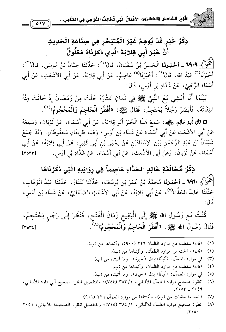 قَالَ أَبُو حَاتِمٍ رَضِيَ اللهُ عَنْهُ: سَمِعَ هَذَا الْخَبَرَ أَبُو قِلَابَةَ، عَنْ أَبِي أَسْمَاءَ، عَنْ ثَوْبَانَ، وَسَمِعَهُ عَنْ أَبِي الأَشْعَثِ، عَنْ أَبِي أَسْمَاءَ، عَنْ شَدَّادِ بْنِ أَوْسٍ، وَهُمَا طَرِيقَانِ مَحْفُوظَانِ، وَقَدْ جَمَعَ شَيْبَانُ بْنُ عَبْدِ الرَّحْمَنِ بَيْنَ الإِسْنَادَيْنِ، عَنْ يَحْيَى بْنِ أَبِي كَثِيرٍ، عَنْ أَبِي قِلَابَةَ، عَنْ أَبِي أَسْمَاءَ، عَنْ ثَوْبَانَ، وَعَنْ أَبِي الأَشْعَثِ، عَنْ أَبِي أَسْمَاءَ، عَنْ شَدَّادِ بْنِ أَوْسٍ. [٣٥٣٣]