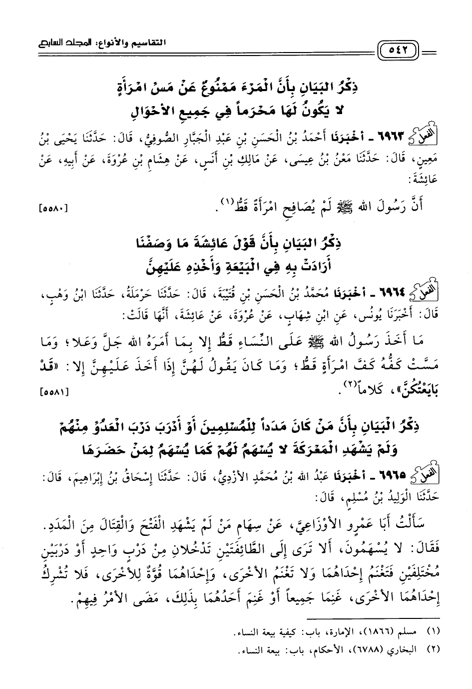 ٦٩٦٣ - أَخبَرنا أَحْمَدُ بْنُ الْحَسَنِ بْنِ عَبْدِ الْجَبَّارِ الصُّوفِيُّ، قَالَ: حَدثنا يَحْيَى بْنُ مَعِينٍ، قَالَ: حَدثنا مَعْنُ بْنُ عِيسَى، عَنْ مَالِكِ بْنِ أَنَسٍ، عَنْ هِشَامِ بْنِ عُرْوَةَ، عَنْ أَبِيهِ، عَنْ عَائِشَةَ، أَنَّ رَسُولَ اللهِ صَلى الله عَلَيه وسَلم لَمْ يُصَافِحِ امْرَأَةً قَطُّ. [٥٥٨٠]